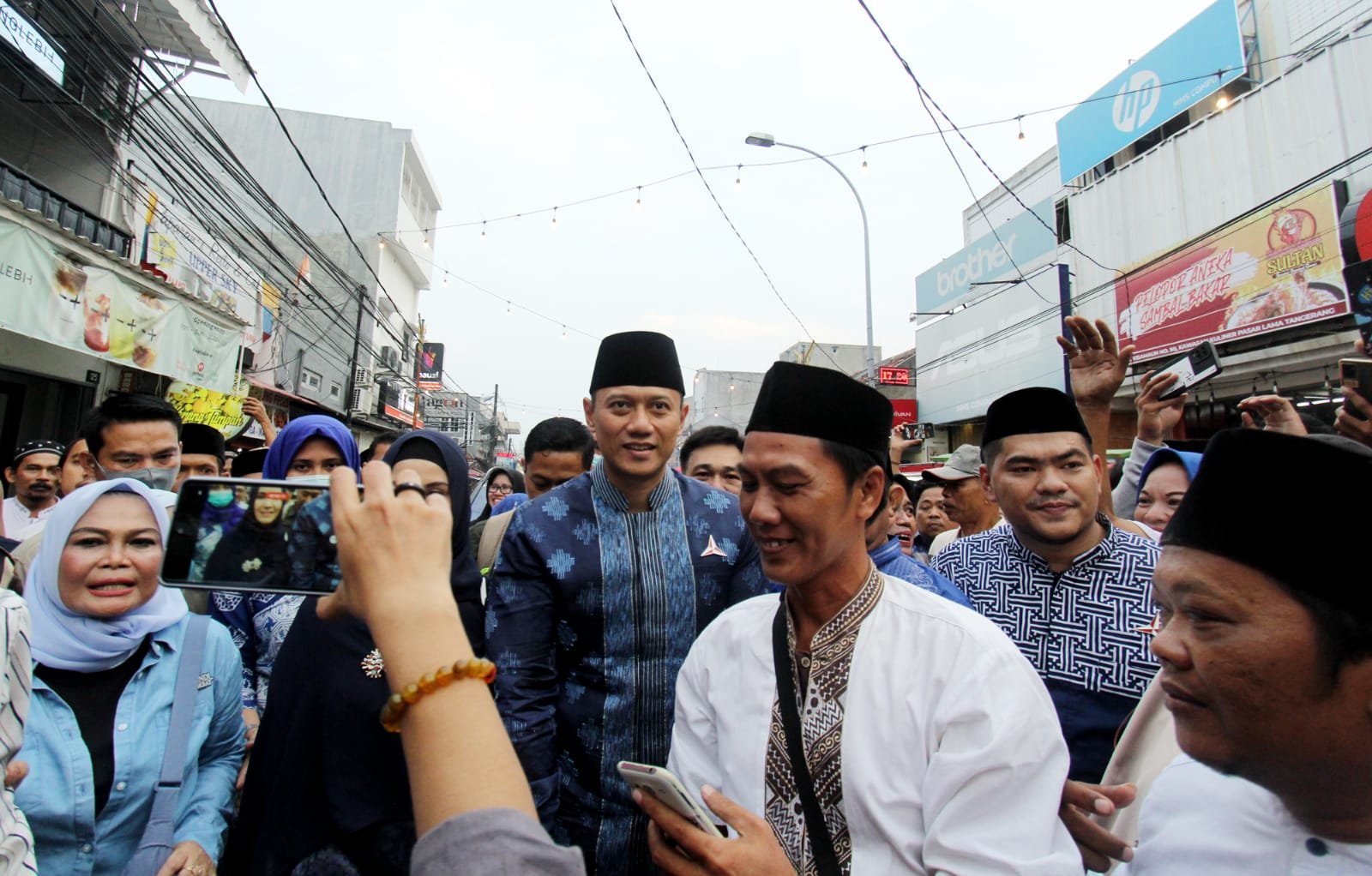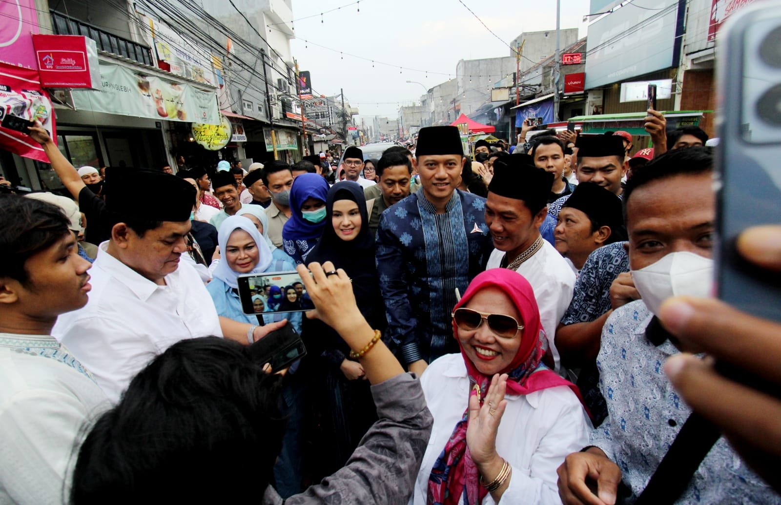 Ketua Umum Partai Demokrat Agus Harimurti Yudhoyono (AHY) menggelar Safari Ramadhan di Pasar Lama Kota Tangerang. Ratusan warga pendukung Partai Demokrat menyambut kedatangan AHY Ketua Umum Partai Demokrat, dalam kunjungannya ini AHY dan istrinya sempat membeli jajanan di Kawasan Wisata Kuliner Pasar Lama Kota Tangerang. Antusias warga yang menyambut ketua umum Partai Demokrat ini begitu meriah. Kedatangan AHY disambut langsung oleh Wali Kota Tangerang Arif R Wismansyah yang juga salah satu kader dari partai tersebut. Selasa (18/04/2023). PotretBanten.com/Leoni.