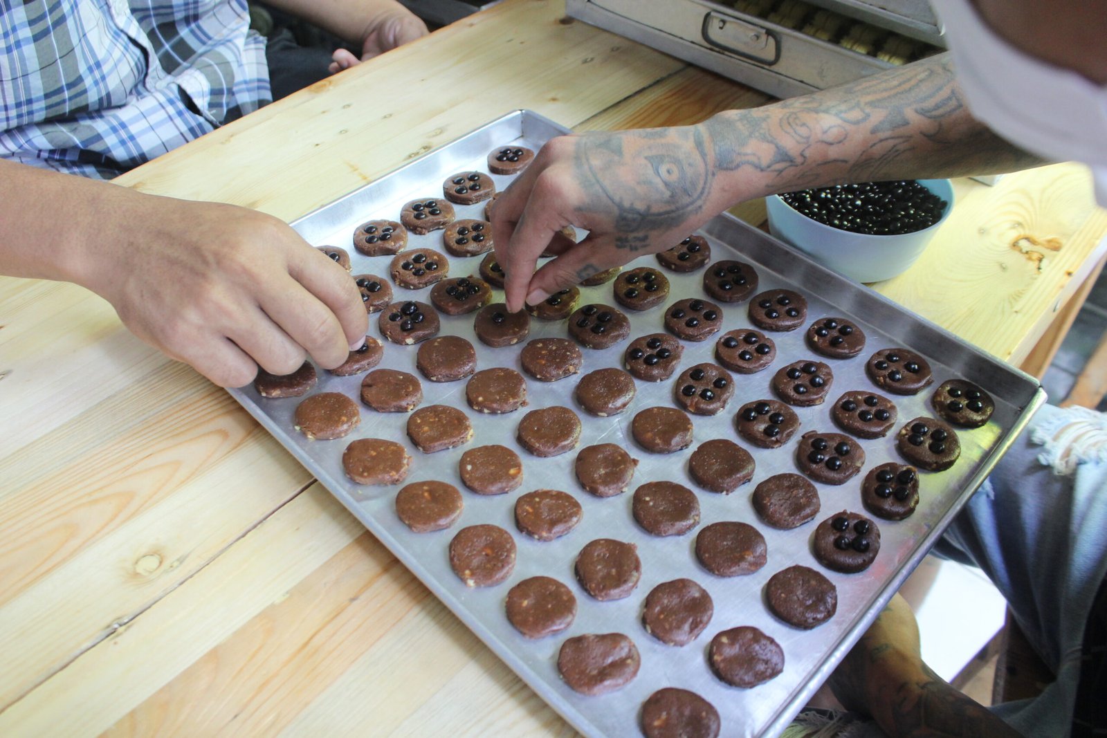 - seorang pekerja sedang mengolesi kuning telur ke kue