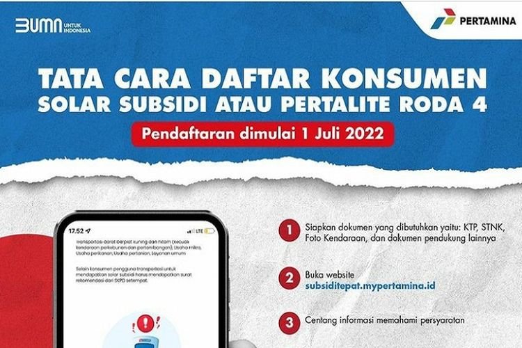 Dilansir dari Website PT Pertamina, PT Pertamina Patra Niaga membuka pendaftaran bahan bakar minyak (BBM) subsidi yang akan dilaksanakan mulai tanggal 1 Juli 2022 di beberapa kota/kabupaten ini diharapkan data diri dan kendaraan konsumen yang berhak mendapatkan BBM subsidi sudah terdaftar semua.
