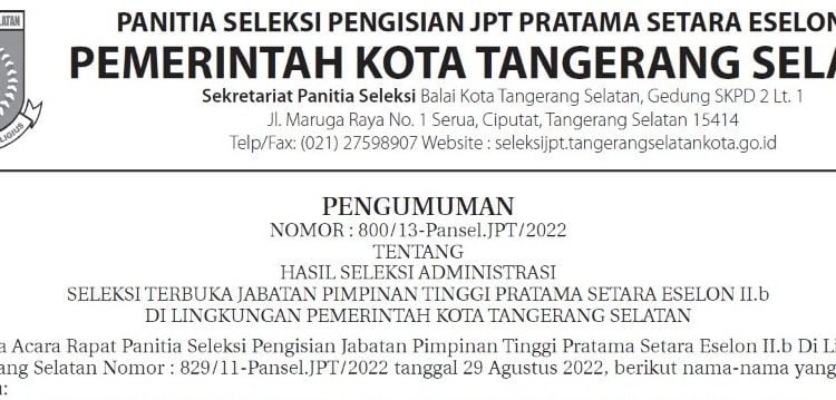 TANGSEL – Daftar peserta yang dinyatakan lolos seleksi administrasi lelang jabatan eselon II.b untuk mengisi tiga jabatan di lingkungan Pemerintah Kota Tangerang Selatan (Tangsel).