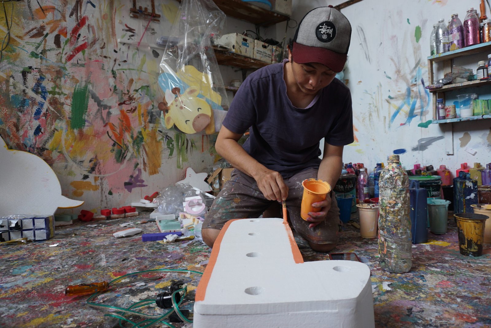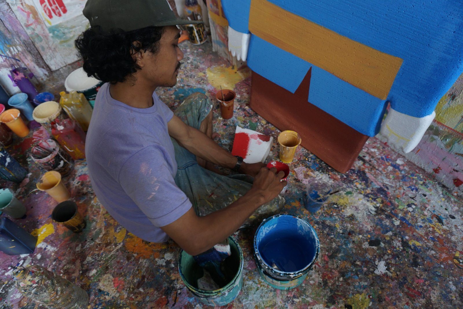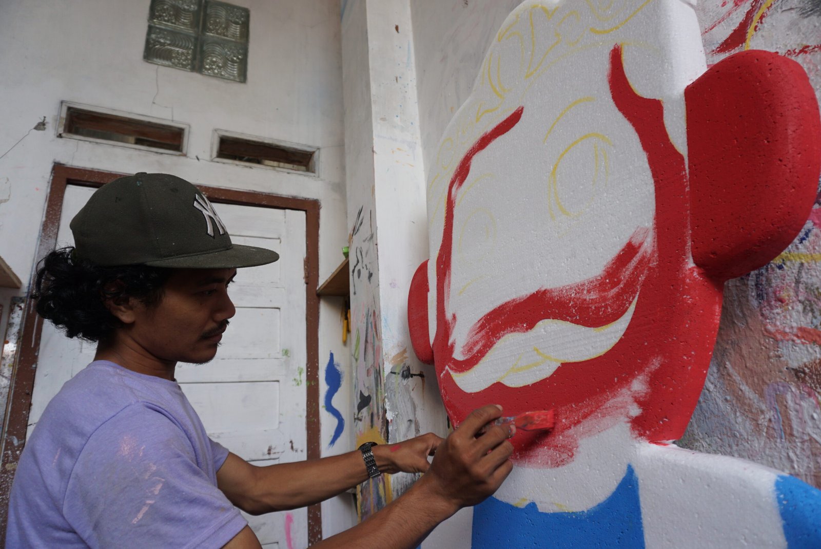 Dekorasi menjadi salah satu hal terpenting untuk menghiasi ruangan menjadi lebih cantik dan menarik dalam sebuah acara. Beragam jenis dekorasi pun bermunculan, salah satunya dekorasi styrofoam karya anak muda di Jalan Nyimas Melati No. 42, RT. 003/RW. 001, Kelurahan Karang Anyar, Kecamatan Neglasari, Kota Tangerang. Bisnis dekorasi ini dilirik usai pandemi Covid-19 berakhir. Koordinator Styrofoam Art, Fahmi Ulumuddin, mengungkapkan usaha dekorasi berbahan styrofoam ini dibuat bersama dengan teman-temannya yang sama-sama menyukai seni lukis, karyanya pun sudah tembus sampai luar negeri. Terlihat seorang pekerja sedang menyelesaikan pesanan nya, berupa ondel-ondel. Kamis (20/7/2023). PotretBanten/Leoni.