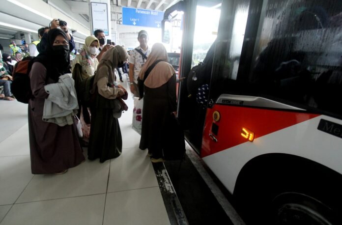 Retno merinci para WNI itu terdiri dari 248 perempuan, 137 laki-laki, dan 43 anak-anak. Setibanya di Jakrta mereka akan diinapkan sementara di Asrama Haji Pondok Gede sebelum pulang ke daerah masing-masing. Tampak terlihat para WNI menaiki mobil jemputan yang telah disediakan oleh Kemenlu. Jumat (28/04/2023).PotretBanten.com/Leoni.