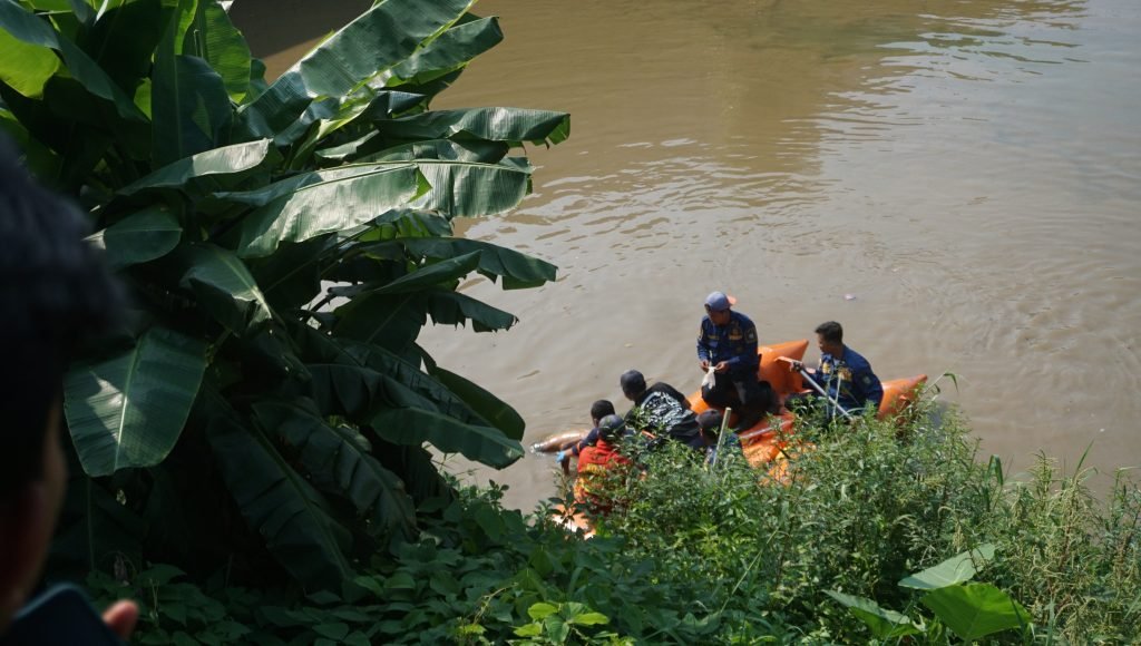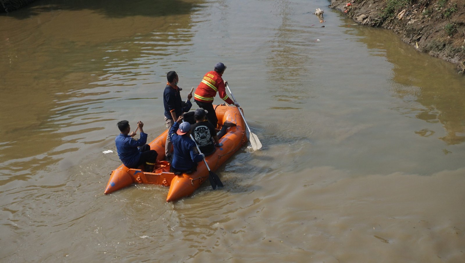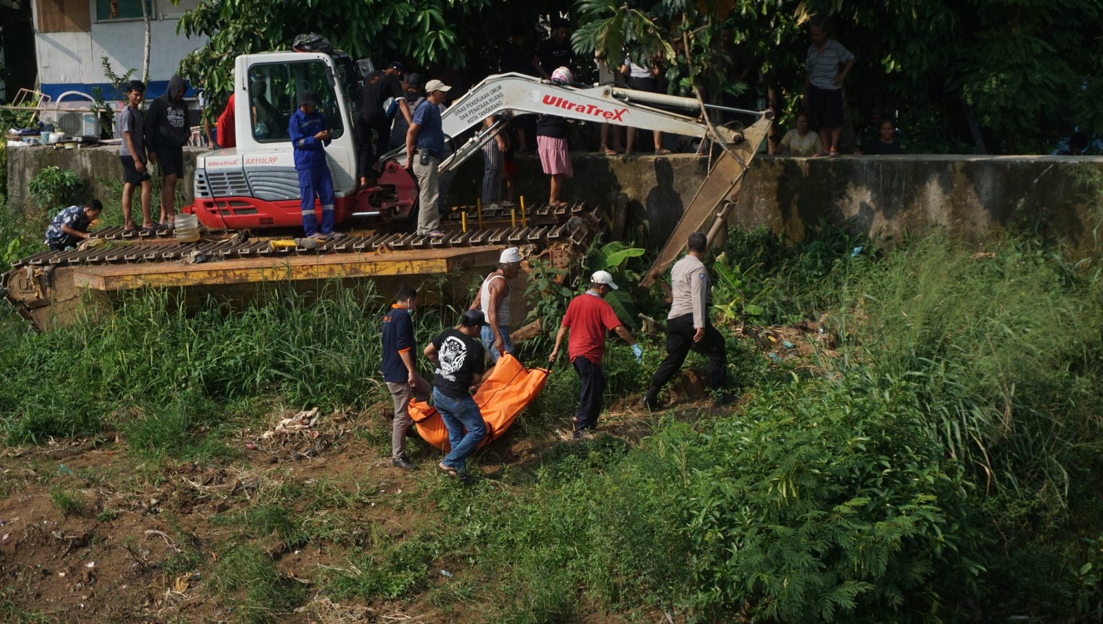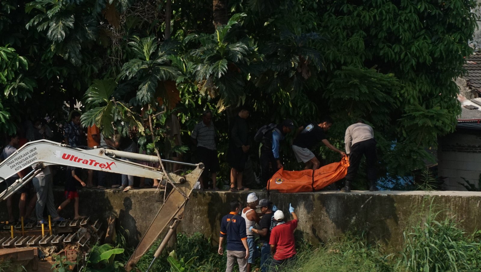 Tim Badan Penanggulangan Bencana Daerah (BPBD) Kota Tangerang dan Kepolisian Polres Metro Tangerang Kota evakuasi mayat laki-laki mengambang di Kali Sabi Kecamatan Periuk Kota Tangerang. Usai di evakuasi jenazah tersebut langsung di bawa menuju Rumah Sakit Umum untuk di adakan autopsi oleh tim INAFIS kepolisian. Jumat (21/04/2023). PotretBanten.com/Leoni.