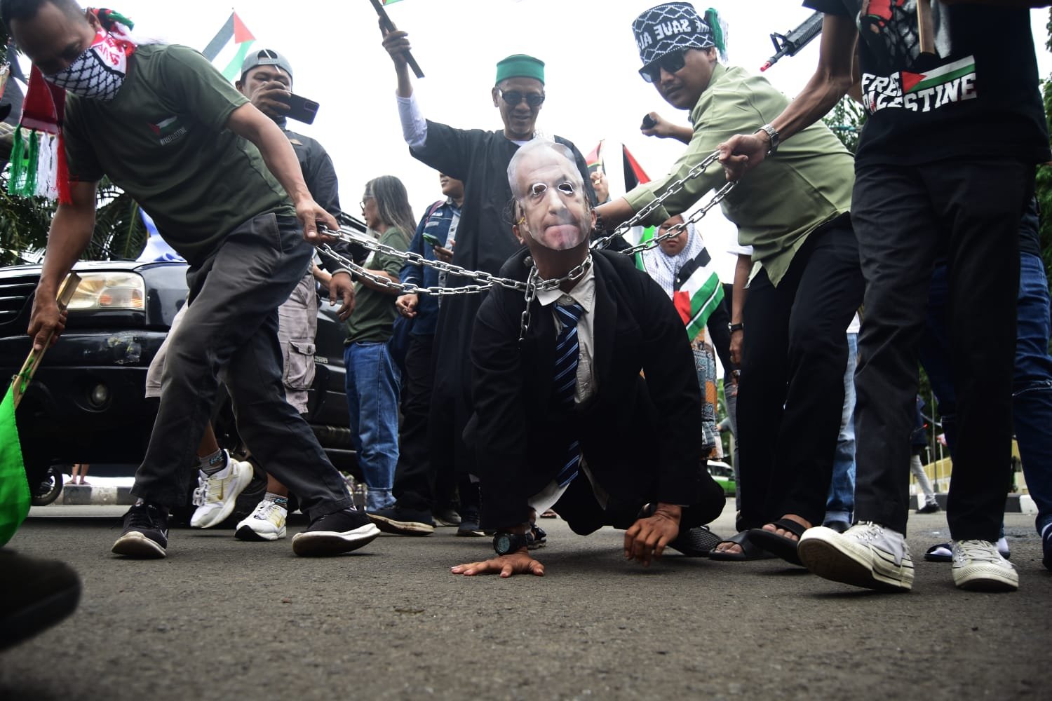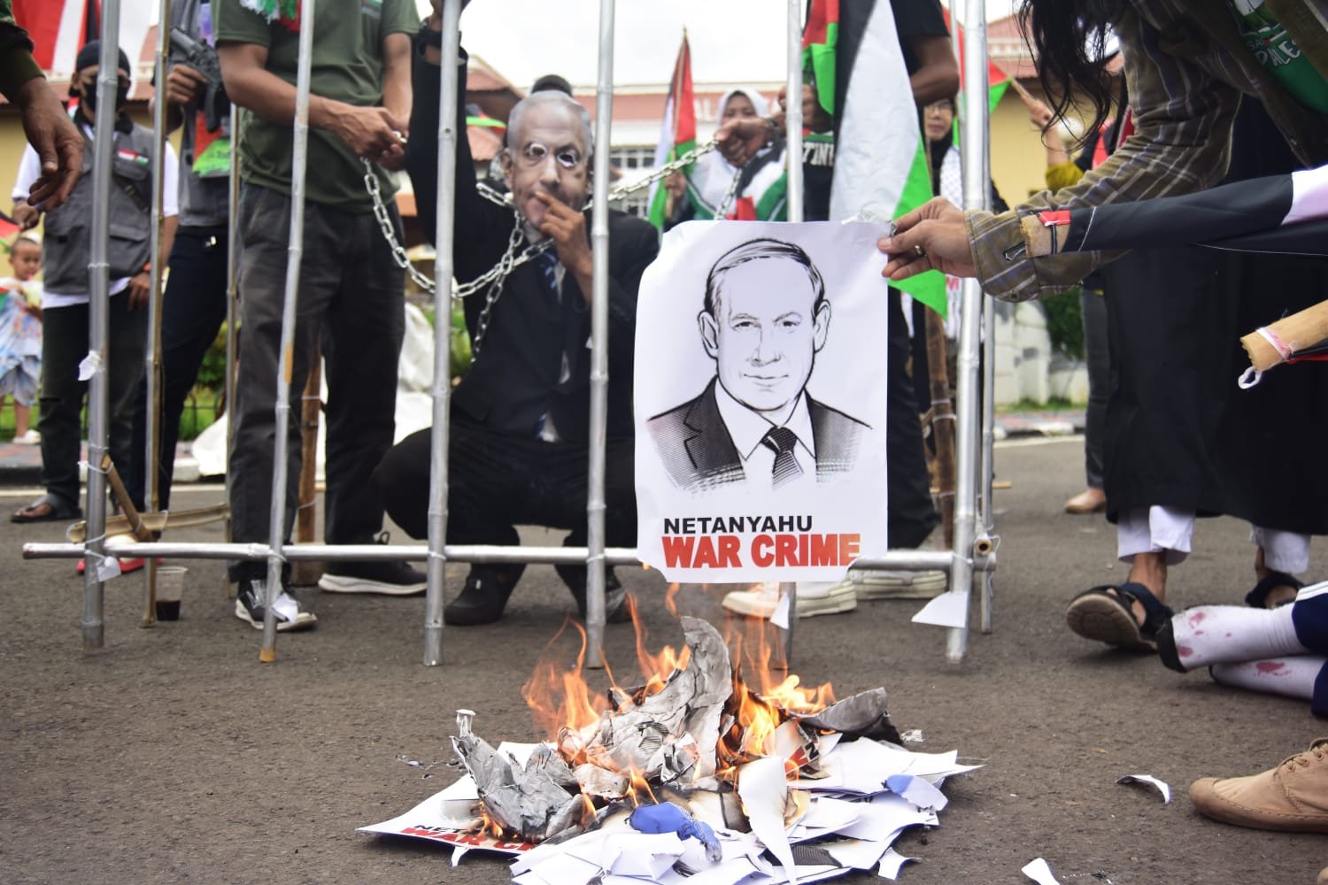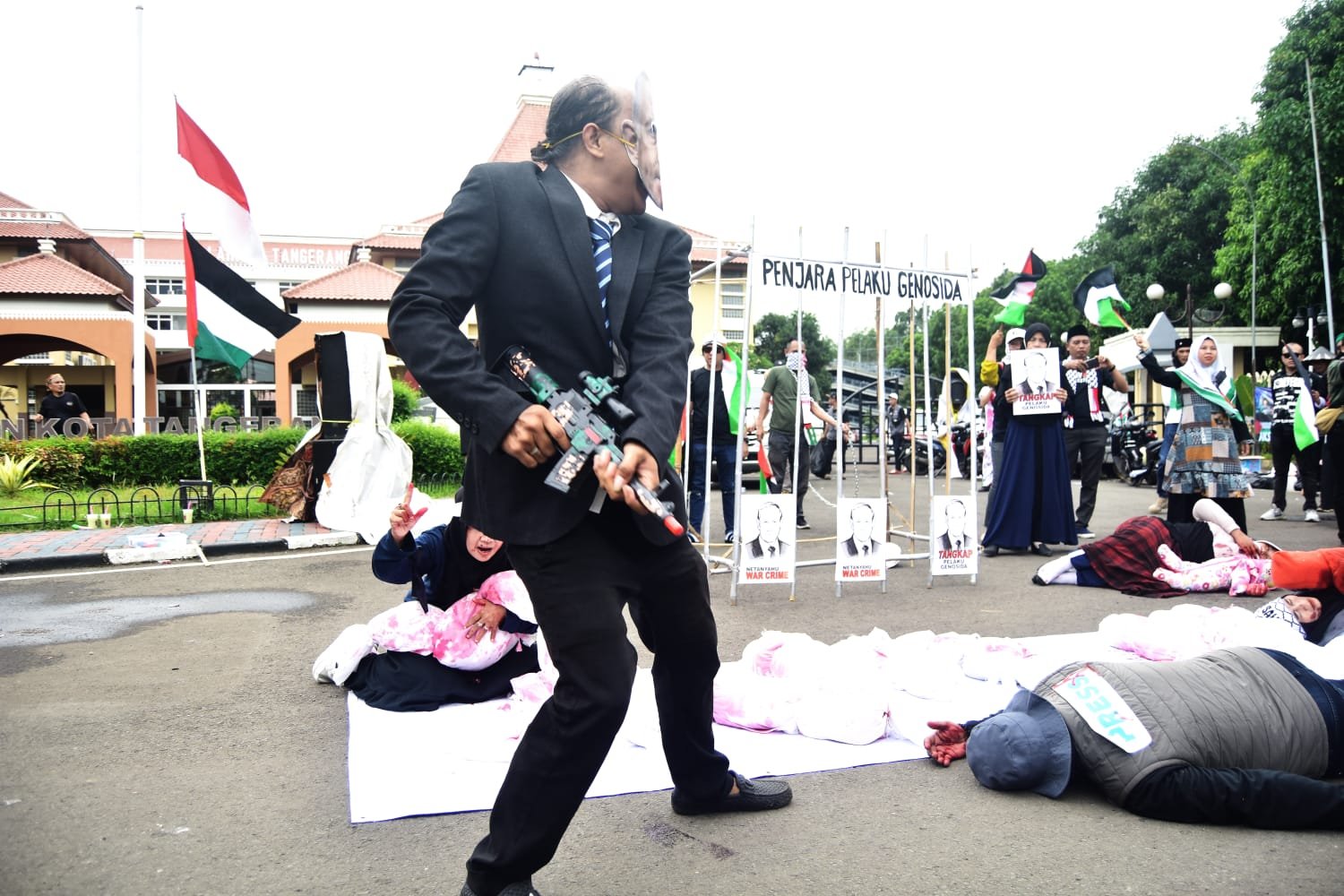 - PotretBanten.com, Tangerang – Jurnalis Tangerang adakan aksi Tangkap Netanyahu Penjahat Perang, dalam aksi tersebut para jurnalis bersama warga Kota Tangerang menampilkan Teatrikal penangkapan Netanyahu di depan Pusat Pemerintahan Kota Tangerang (taman elektrik ). Tampak terlihat dalam Teatrikal tersebut Netanyahu di rantai dan diarak seperti anjing dan dimasukan ke penjara. Jumat (6/12/24). PotretBanten.com/Leoni.