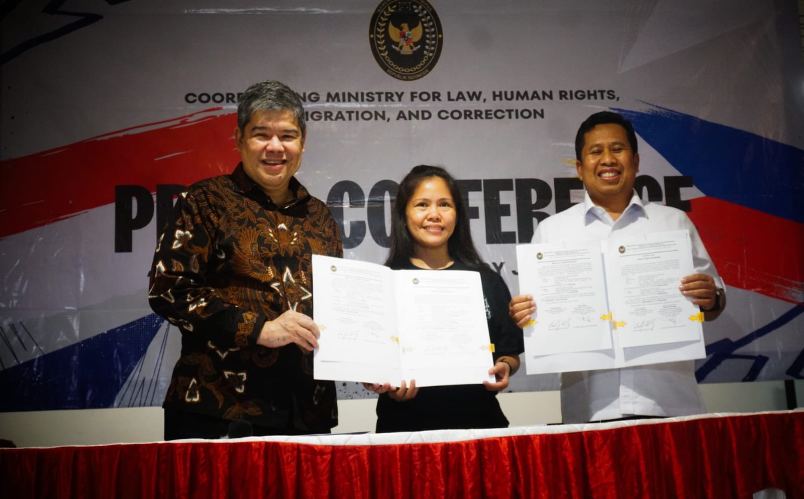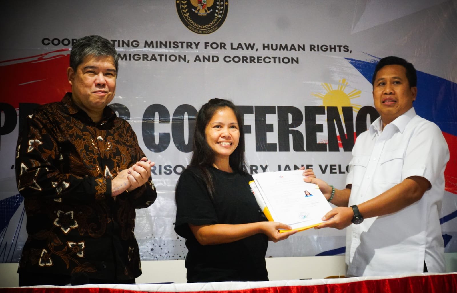 Mary Jane di pulangkan ke Philipina hari ini, penyerahan Mary Jane terpidana Hukuman Mati dilaksanakan di Bandara Soekarno Hatta terminal 2F. Dalam penyerahannya Mary Jane didampingi oleh duta besar Philipina. Terpidana mati kasus penyelundupan narkoba Mary Jane Veloso mengucapkan terima kasih kepada Presiden RI Prabowo Subianto dan Menteri Koordinator Bidang Hukum, HAM, Imigrasi, dan Pemasyarakatan Yusril Ihza Mahendra karena telah menyetujui pemindahannya ke negara asal, Filipina. Tampak terlihat Mery Jane tersenyum bahagia. Selasa (17/12/24).PotretBanten.com/Leoni.