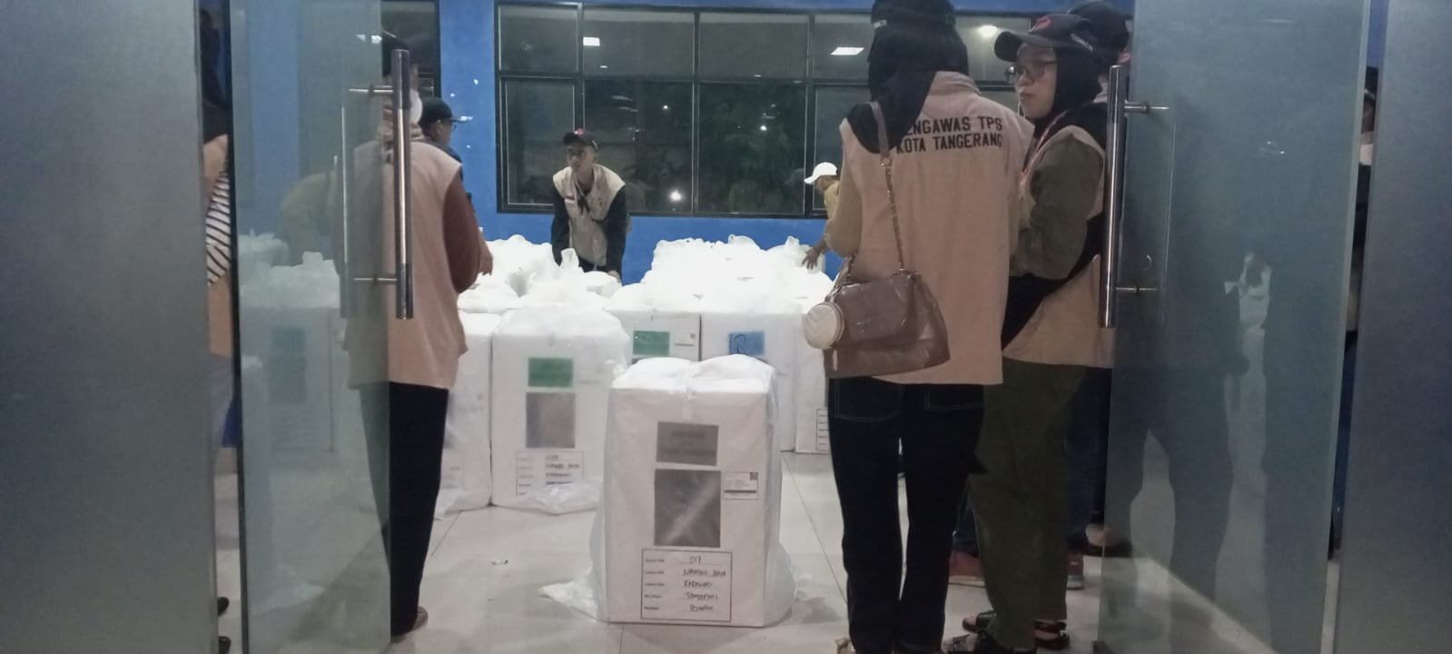 Mulai malam ini logistik Pemilu di Distribusikan ke seluruh Tempat Pemungutan Suara (TPS) yang berada di setiap kelurahan. Kelurahan Nambo Jaya Kecamatan Karawaci Kota Tangerang mendistribusikan Logistik Pemilu ke 21 TPS dari 5 RW yang ada di Kelurahan tersebut. Dengan pengawalan TNI, Polri, Petugas Kelurahan dan pengawas PTPS ikut serta mendistribusikan logistik. Tampak terlihat para petugas sedang mengangkut Logistik Yang akan di distribusikan. Selasa (13/2/24). baksampah.me/Leoni.