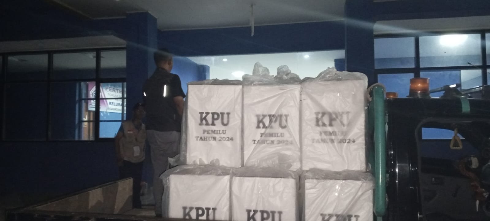 Mulai malam ini logistik Pemilu di Distribusikan ke seluruh Tempat Pemungutan Suara (TPS) yang berada di setiap kelurahan. Kelurahan Nambo Jaya Kecamatan Karawaci Kota Tangerang mendistribusikan Logistik Pemilu ke 21 TPS dari 5 RW yang ada di Kelurahan tersebut. Dengan pengawalan TNI, Polri, Petugas Kelurahan dan pengawas PTPS ikut serta mendistribusikan logistik. Tampak terlihat para petugas sedang mengangkut Logistik Yang akan di distribusikan. Selasa (13/2/24). baksampah.me/Leoni.