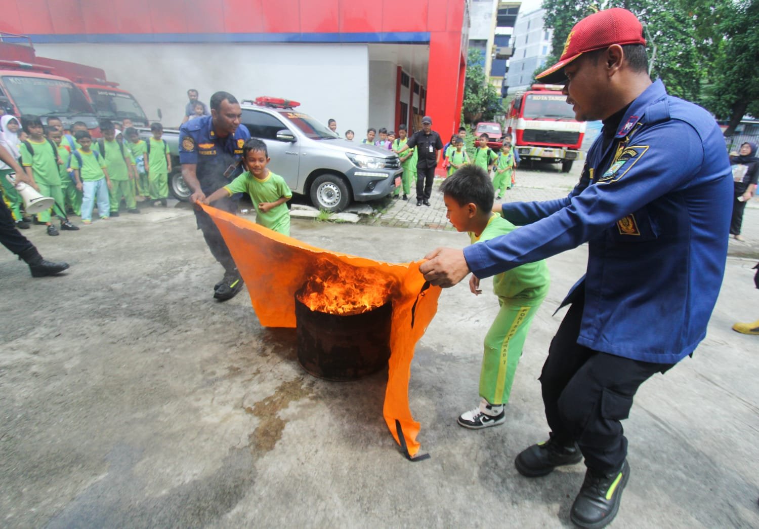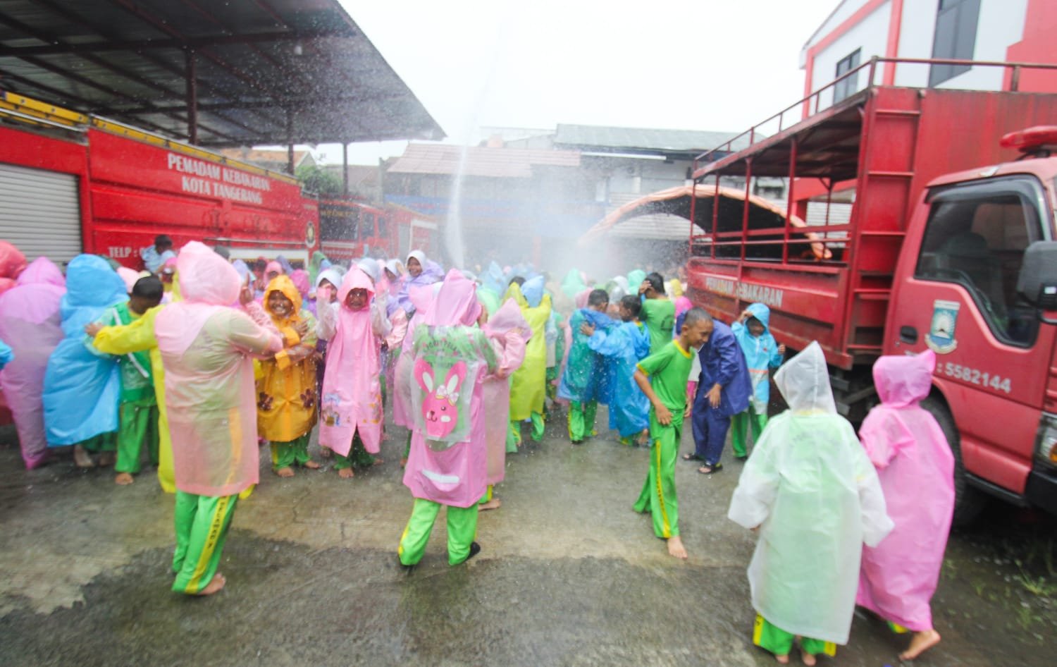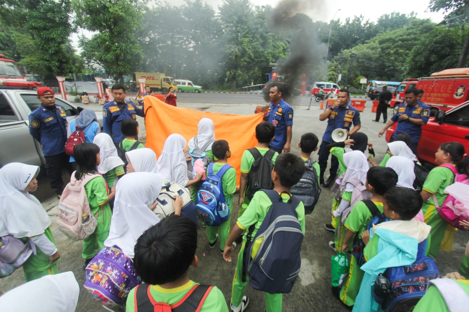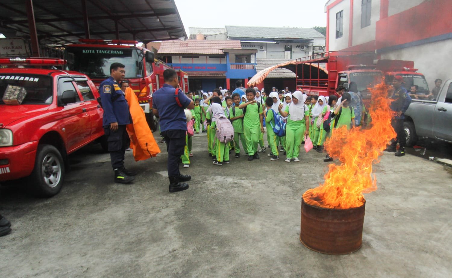 Setiap tanggal 2 Mei seluruh rakyat Indonesia merayakan Hari Pendidikan Nasional (Hardiknas). Hari Pendidikan Nasional ini ditetapkan juga untuk memperingati salah satu pahlawan nasional Ki Hajar Dewantara. Tema Hari Pendidikan Nasioanal tahun 2024 ini adalah “Bergerak Bersama, Lanjutkan Merdeka Belajar”.Tema ini sesuai dengan yang dilakukan SD Negeri Poris Plawad 7, dengan mengunjungi kantor Badan Penanggulangan Bencana Daerah (BPBD) dan Pemadam Kebakaran. Kegiatan tersebut menjadi salah satu bagian dari Kurikulum Merdeka dan Pendidikan Pancasila. Tampak terlihat anak-anak sekolah dasar sedang berusaha memadamkan api didampingi oleh petugas pemadam kebakaran kota tangerang di mako damkar Kota Tangerang. Kamis (2/5/2024). PotretBanten.com/Leoni.