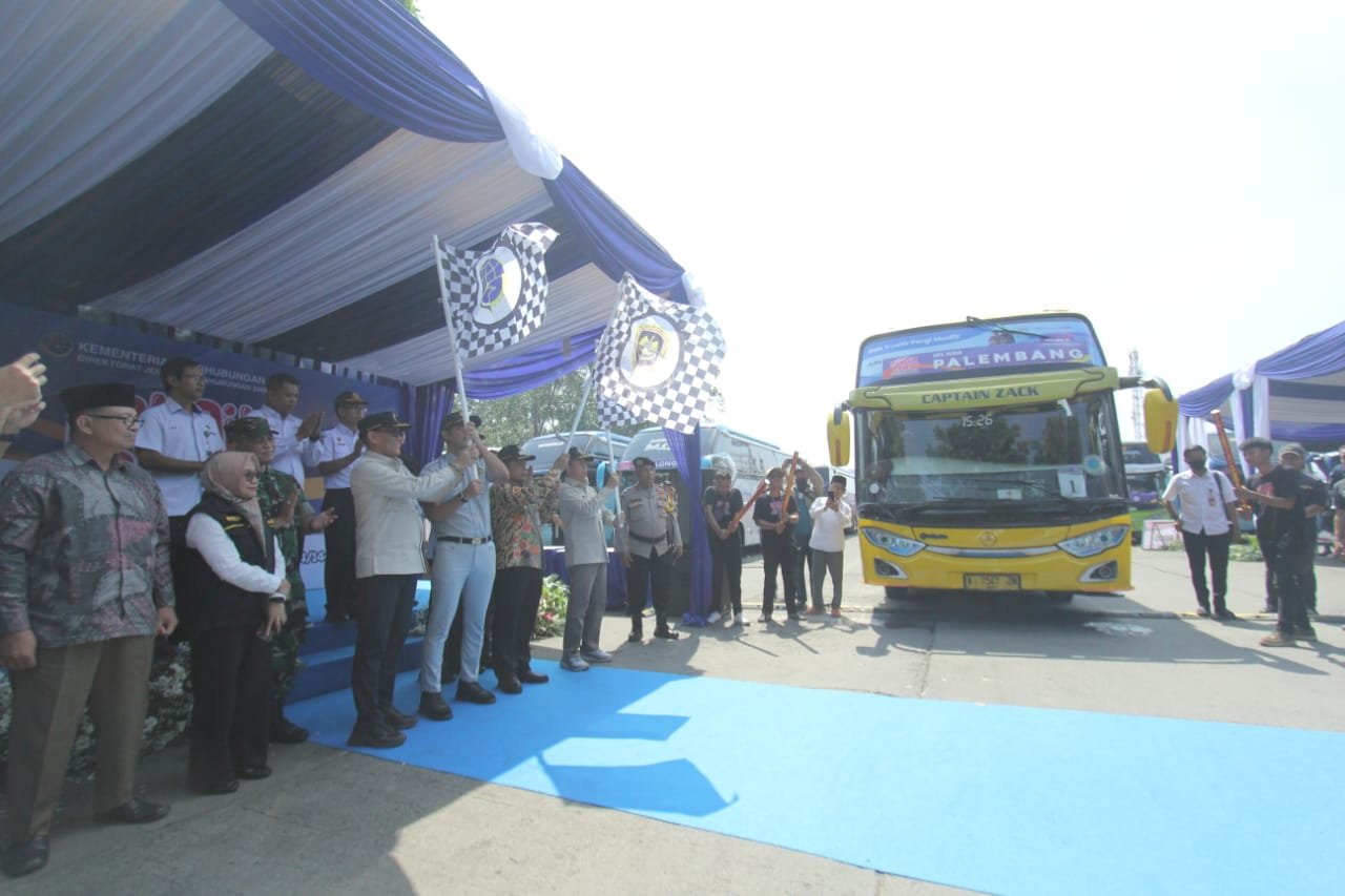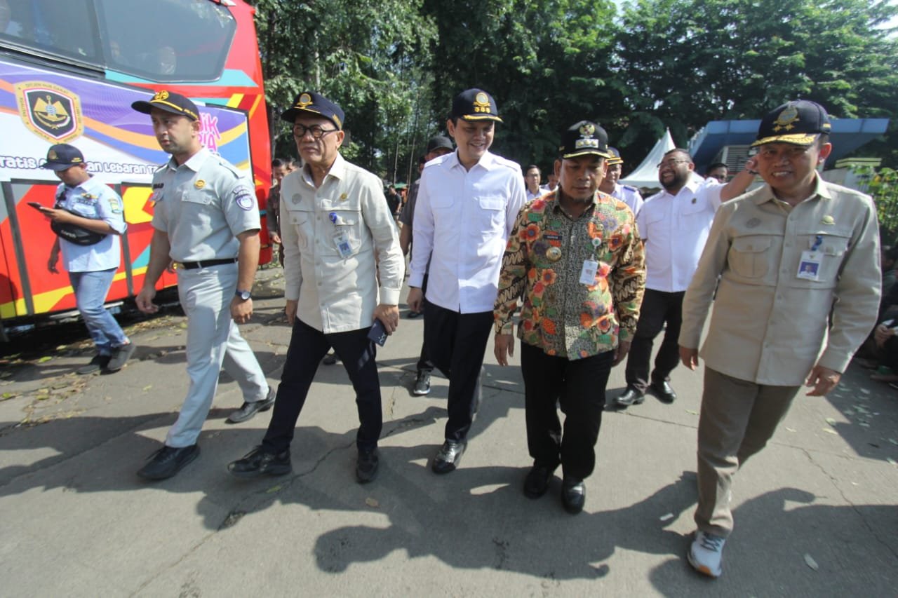 Sebanyak 3775 pemudik berkumpil di Terminal Poris Plawad Kota Tangerang , 75 armada dengan 33 tujuan. Keberangkatan para pemudik dilepas oleh Dirjen Perhubungan dan Pj Walikota Tangerang dalam program Mudik Gratis. Minggu (7/4/2024). PotretBanten.com/Leoni.