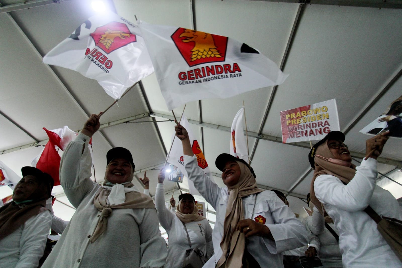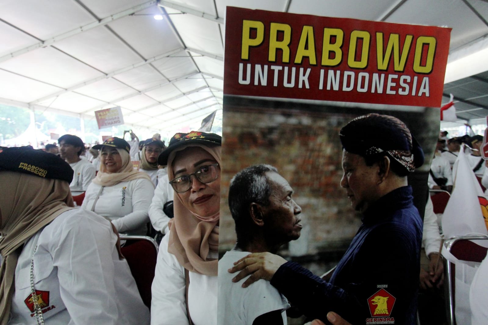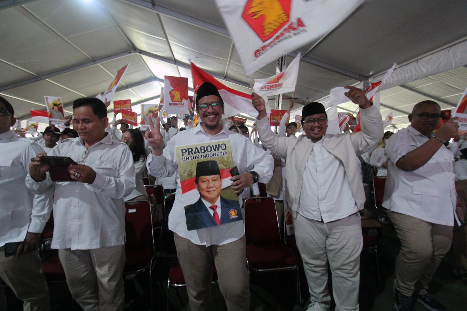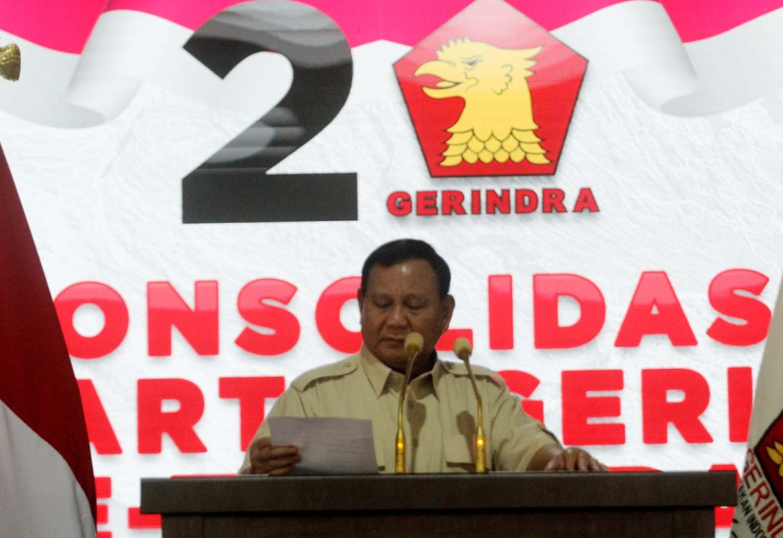 Ketua Umum Partai Gerindra Prabowo Subianto menghadiri konsolidasi akbar pengurus Gerindra Tangerang Raya di Lapangan Ahmad Yani, Kota Tangerang. Prabowo didampingi Ketua Harian Gerindra Dasco keacara tersebut. Konsolidasi Akbar bertema Berjuang Bersatu Menuju Kemenangan Pemilu 2024 ini ,disambut riuh ribuan kader dan simpatisan Gerindra se-Tangerang Raya, untuk menjaga kekompakan jelang Pemilu 2024. Minggu (9/7/2023).baksampah.me/Leoni.