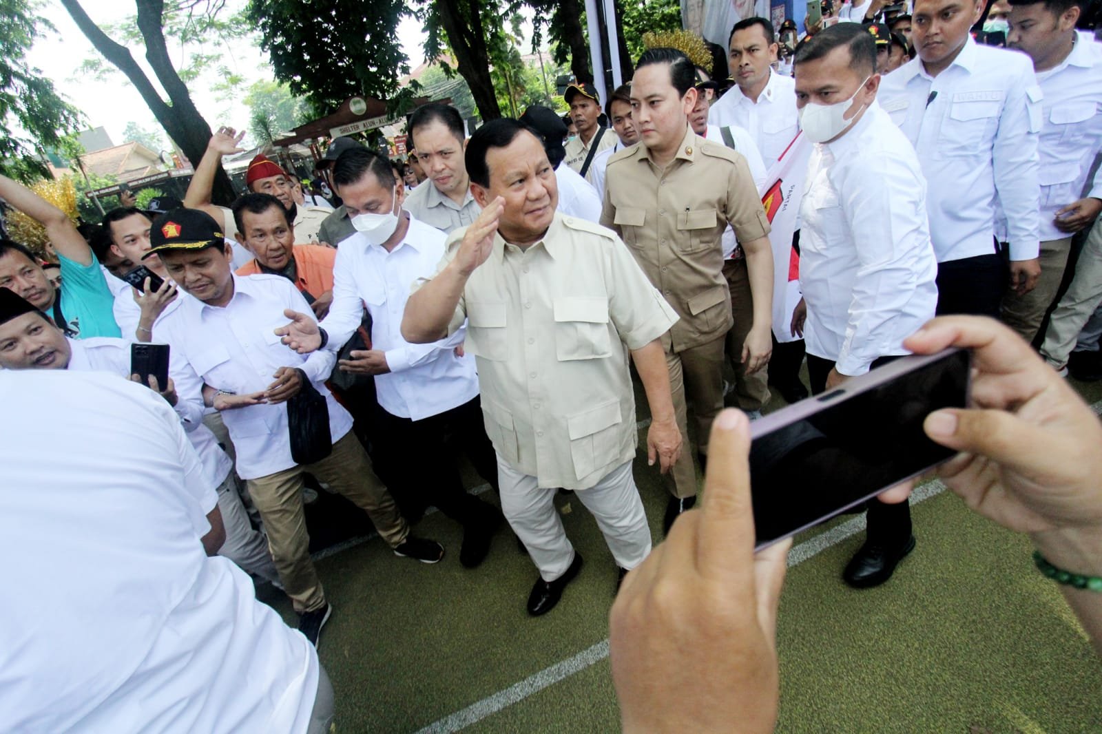 Ketua Umum Partai Gerindra Prabowo Subianto menghadiri konsolidasi akbar pengurus Gerindra Tangerang Raya di Lapangan Ahmad Yani, Kota Tangerang. Prabowo didampingi Ketua Harian Gerindra Dasco keacara tersebut. Konsolidasi Akbar bertema Berjuang Bersatu Menuju Kemenangan Pemilu 2024 ini ,disambut riuh ribuan kader dan simpatisan Gerindra se-Tangerang Raya, untuk menjaga kekompakan jelang Pemilu 2024. Minggu (9/7/2023).baksampah.me/Leoni.
