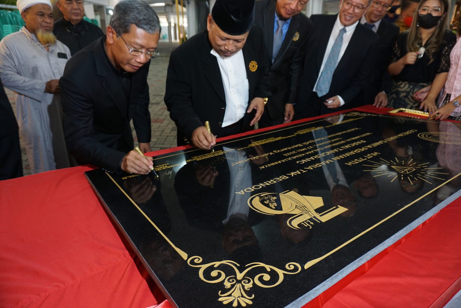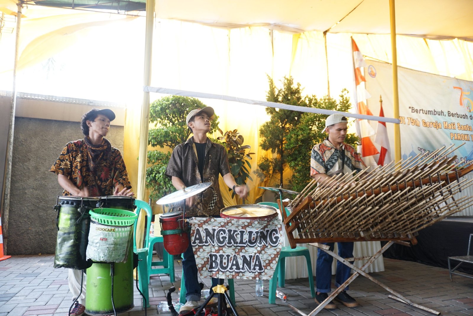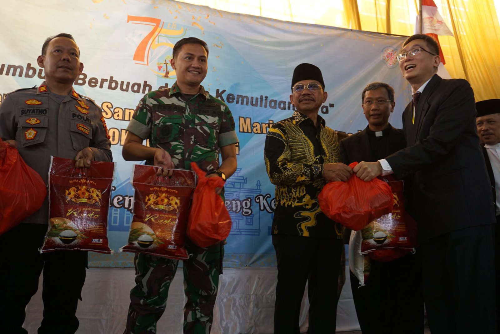 Wakil Walikota Tangerang Sachrudin potong tumpeng di hari ulangtahun Gereja Paroki Hati Santa Perawan Maria Perawan Tak Bernoda (HSPMTB) Tangerang ke 75 tahun yang diadakan di Halaman Gereja Katolik Paroki HSPMTB Jalan Raya Daan Mogot Kota Tangerang. Dalam perayaannya kali ini pihak gereja membagikan sembako bagi warga sekitarnya dan dimeriahkan oleh grup musik Angklung jalanan. Terlihat H. Amin Munawar Ketua Forum Kerukunan Umat Beragama (FKUB) Kota Tangerang Menandatangani prasasti di lokasi yang sama. Sabtu (27/5/23).Potretbanten.com/Leoni.