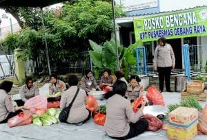Petugas gabungan dari TNI , Polri, Satpol PP, BPBD (Damkar), PMI Kota Tangerang, dan relawan lainnya berusaha membantu warga yang melakukan aktivitasnya dengan menggunakan perahu. Terlihat para relawan sedang mengevakuasi warga, dan para anggota Polwan sedang mempersiapkan makanan bagi warga yang mengungsi. Rabu (15/3/2023). Potret Banten/Leoni.
