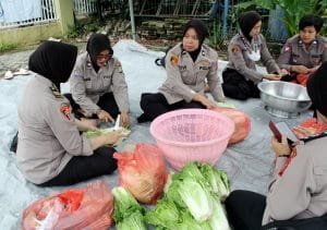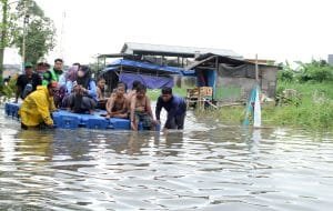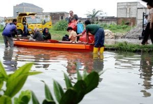 Petugas gabungan dari TNI , Polri, Satpol PP, BPBD (Damkar), PMI Kota Tangerang, dan relawan lainnya berusaha membantu warga yang melakukan aktivitasnya dengan menggunakan perahu. Terlihat para relawan sedang mengevakuasi warga, dan para anggota Polwan sedang mempersiapkan makanan bagi warga yang mengungsi. Rabu (15/3/2023). Potret Banten/Leoni.