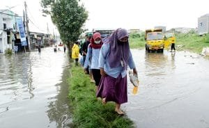 Intensitas hujan yang turun sejak Selasa malam (14/3/2023) menyebabkan kali Ledug meluap hingga memutuskan jalur penghubung antara Sangiang dengan perumahan Total Persada Kecamatan Periuk.