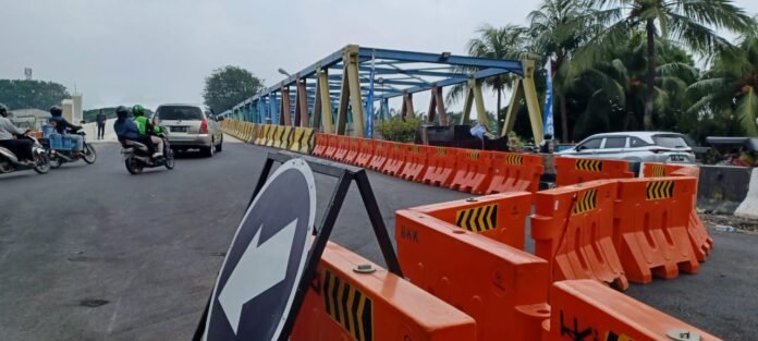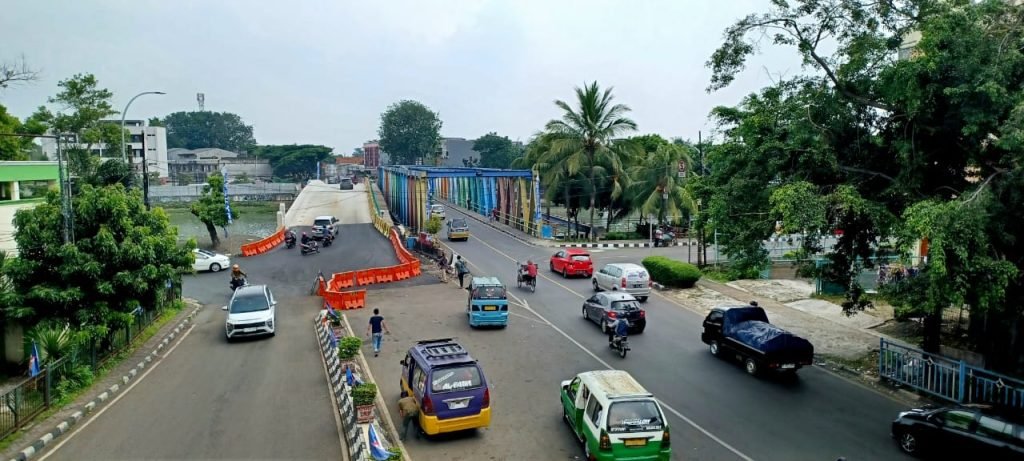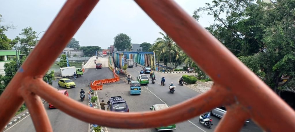 Pengerjaan infrastruktur Jembatan Cisadane jalan Merdeka, Kota Tangerang yang dilakukan pihak Kementrian PUPR ini dimulai sejak 20 Juli 2022, dan sudah dapat dilalui kendaraan roda dua maupun roda empat. Pembangunan jembatan yang menjadi program pemerintah pusat Kementerian Pekerjaan Umum dan Perumahan Rakyat (PUPR) sydah mencapai 80% jelang Lebaran sudah mulai dilalui kendaraan. Terlihat beberapa kendaraan melintasi Jembatan Cisadane jalan Merdeka. Selasa(18/04/2023).PotretBanten.com/Leoni.
