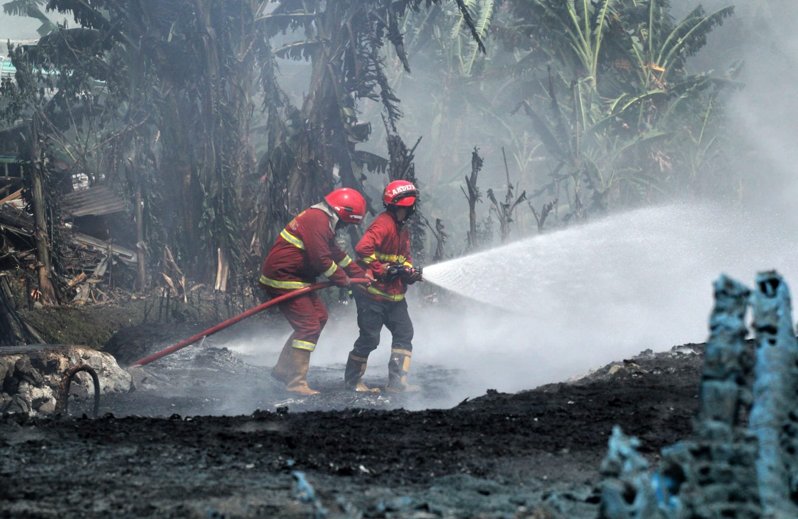 - Dua orang pemedam kebakaran sedang berusaha memadamkan api