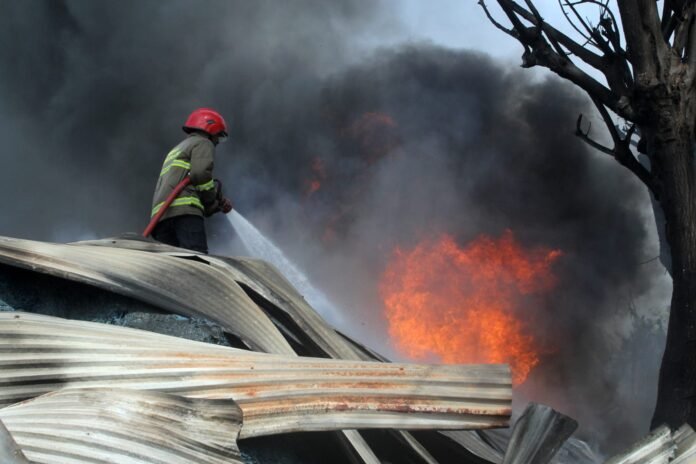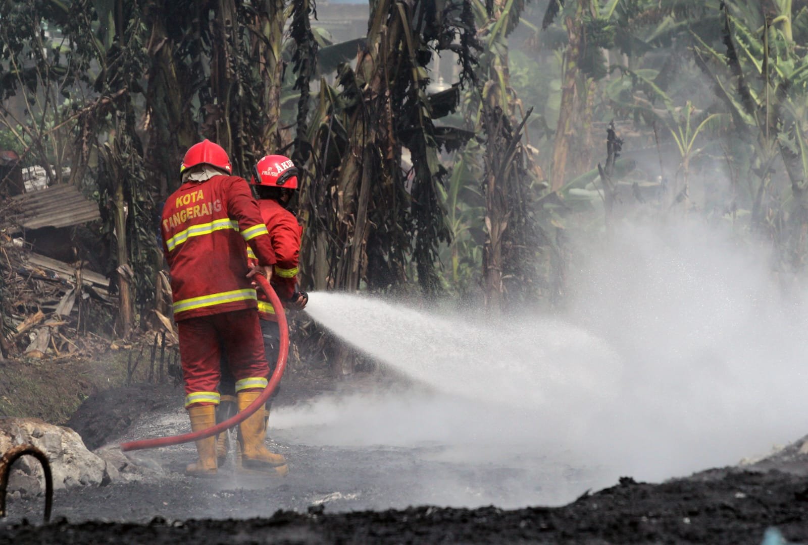 Sebuah gudang limbah palet plastik yang berada di tengah kawasan perumahan penduduk Kelurahan Keroncong, Kecamatan Jatiuwung, Kota Tangerang, ludes terbakar diduga akibat pembakaran sampah, Jumat(12/1/2024). Api besar dan langit tebal yang muncul di jam 12.00 sempat membuat panik warga. Damkar pun dengan sigapnya langsung memadamkan api dengan mengerahkan 50 personil dan 11 mobil pemadam kebakaran. Jumat(12/1/2024)baksampah.me/Leoni.