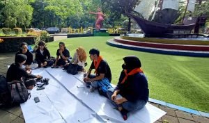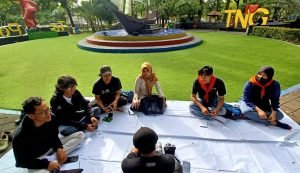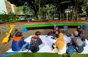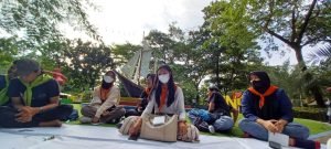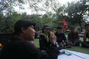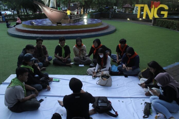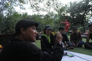 Sejumlah Mahasiswa yang tergabung dalam Mahasiswa Pencinta Alam (MAPALA) MAHESA UMT Kota Tangerang  di bulan Ramadhan ini mereka melaksanakan buka bersama dengan melakukan Pekan Belajar MAPALA MAHESA dengan konsep belajar bersama, acara yang dilaksanakan di Taman Potret Kota Tangerang ini dengan mengusung kegiatan berbagi ilmu. Pada kesempatan ini mereka belajar tentang foto dokumentasi dimana materi tersebut sangat dibutuhkan dalam pembuatan laporan sesudah ekspedisi, materi yang dibawakan oleh fotografer Dennys Codet lebih kepada foto dan video dokumenter dimana kegiatan tersebut untuk mempermudah anggota dalam pembuatan laporan secara digital. Tampak terlihat sejumlah anggota Mapala MAHESA UMT Kota Tangerang sedang menerima materi dari narasumber. Sabtu (1/4/2023). PotretBanten/Leoni.