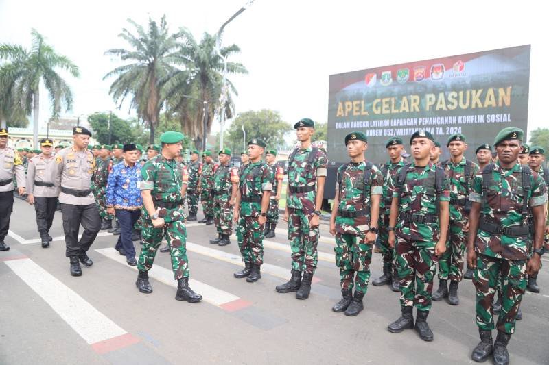 Apel dipimpin Komandan Korem 052/Wijayakrama Brigjen TNI Krido Pramono, memastikan kesiapan personel dan materil dalam menjaga keamanan selama proses demokrasi berlangsung.