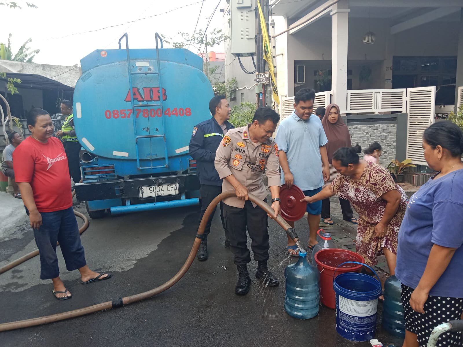 Musim kemarau di Kota Tangerang membuat warga sulit mendapatkan air bersih. Satlantas Polres Metro (Restro) Tangerang Kota bergerak membantu warga dengan memberikan bantuan 7.000 liter air bersih kepada warga Perumahan Periuk Jaya Permai RT 04 RW 08 Keluharan Periuk Jaya, Kecamatan Periuk, Kota Tangerang. Senin (18/09/2023).