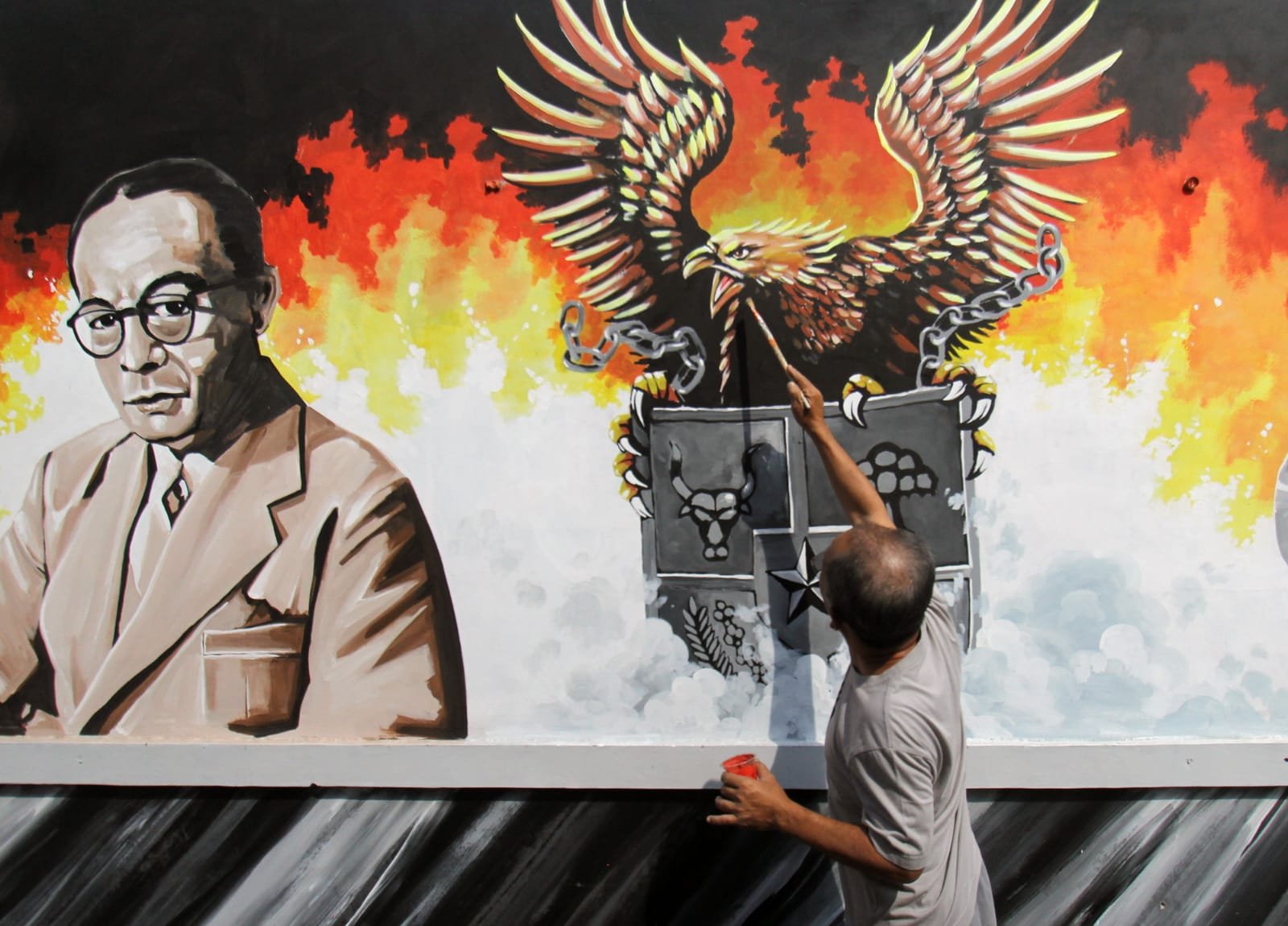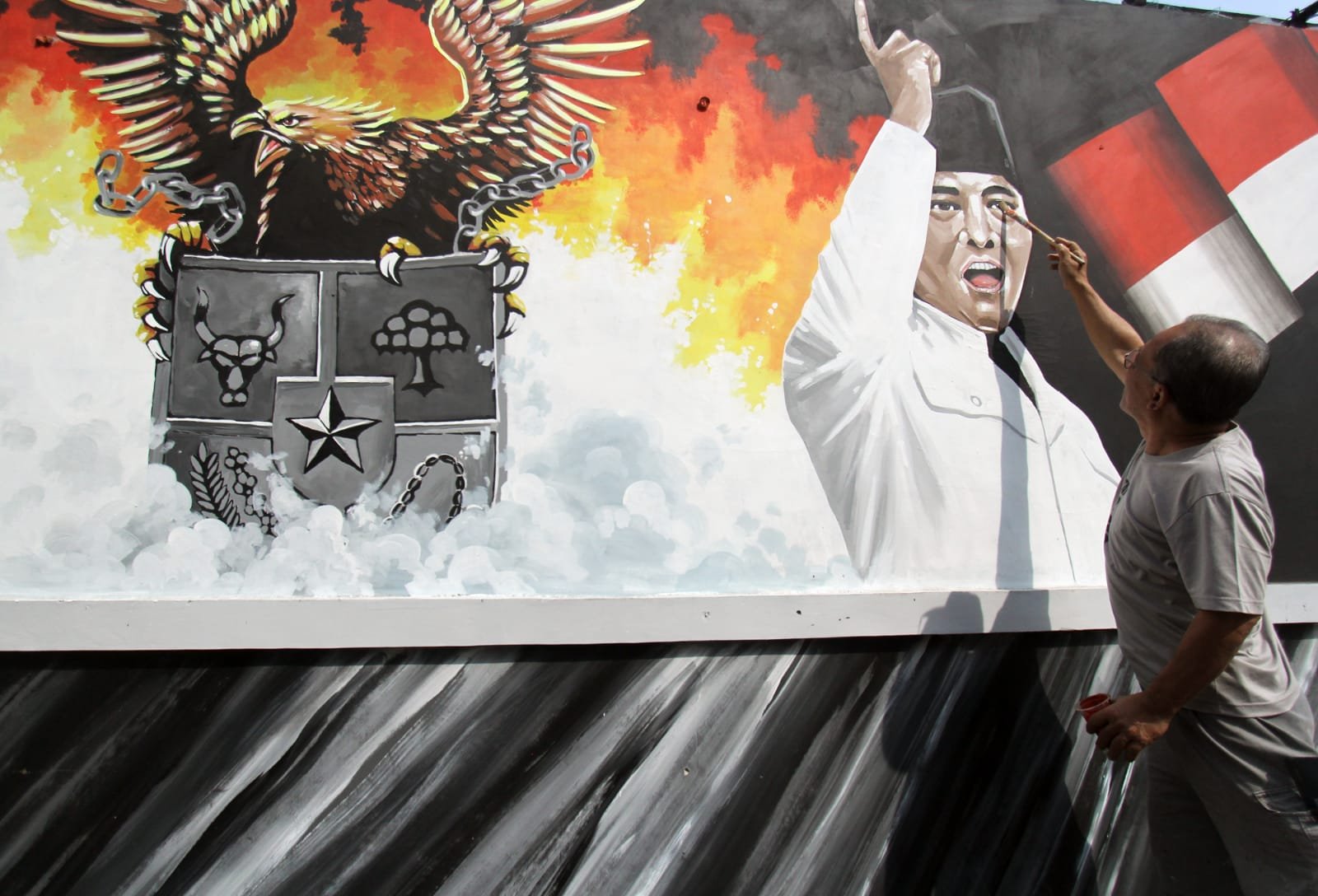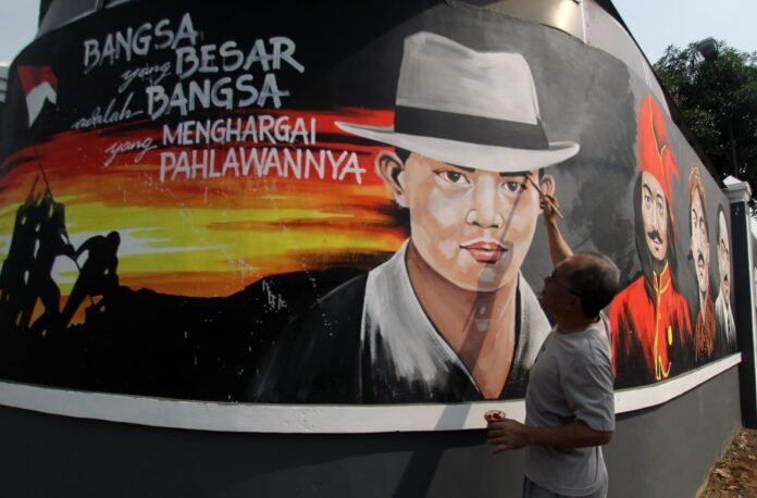 Mural bertema pahlawan tersebut dibuat sebagai sarana edukasi masyarakat menjelang perayaan HUT ke-78 RI sekaligus memperindah kawasan tersebut. Kedepannya tak hanya lukisan bertema pahlawan saja Dendi Mulfianto dan warga bergotong royong melukis dengan tema edukasi lainnya, yang kemungkinan nantinya kampung tersebut akan membuat kampung tematik yang diberinama kampung 3D. Terlihat seorang pelukis Dendy Mulfianto sedang menyelesaikan karya lukisannya. Minggu (13/8/23) baksampah.me/Leoni.