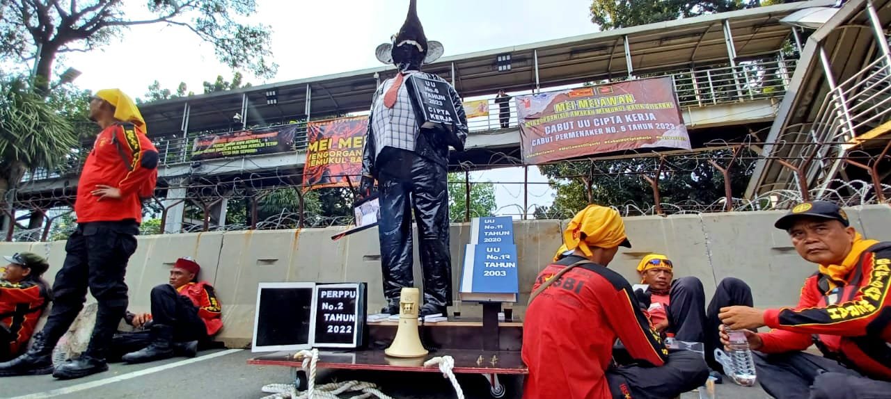 Ribuan buruh menggelar aksi demo pada hari ini,di area patung kuda Tugu Monas, Senin(1/5/23), dalam rangka memperingati Hari Buruh Internasional (May Day). Peringatan tahunan ini biasanya diisi dengan kegiatan aksi para buruh turun kejalan untuk menyampaikan sejumlah tuntutan terkait kesejahteraan pekerja. Ada 7 tuntutan buruh di May Day 2023 ini, diantaranya HOSTUM (Hapus Out Scorsing tolak upah murah. Tampak terlihat patung tikus yang mengenakan dasi dan jas simbol pejabat di negeri ini. Senin(1/5/2023).PotretBanten.com/Leoni.