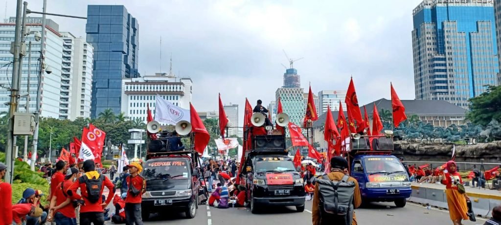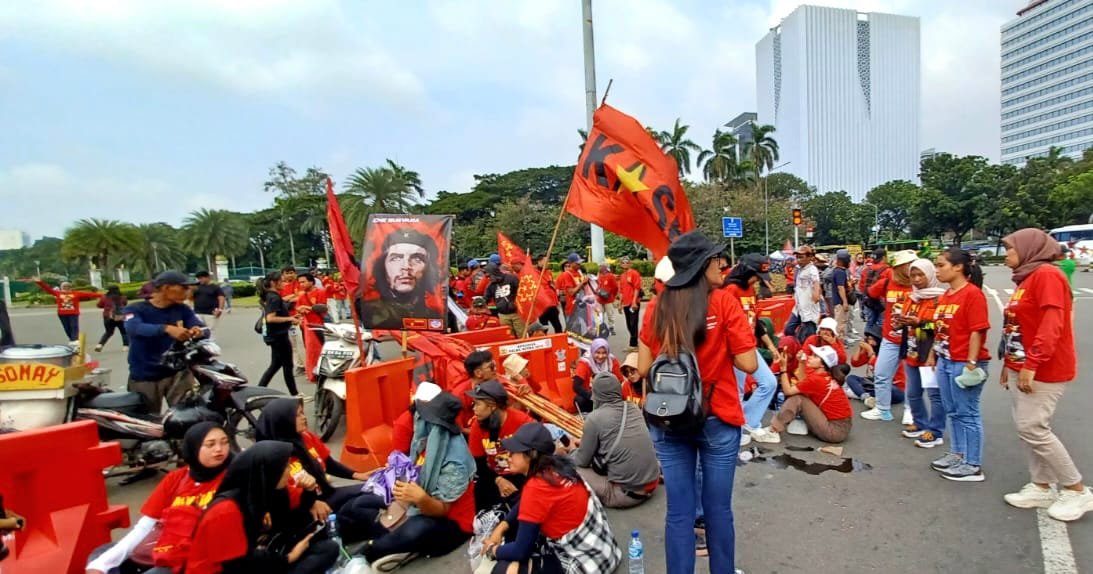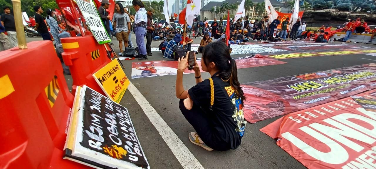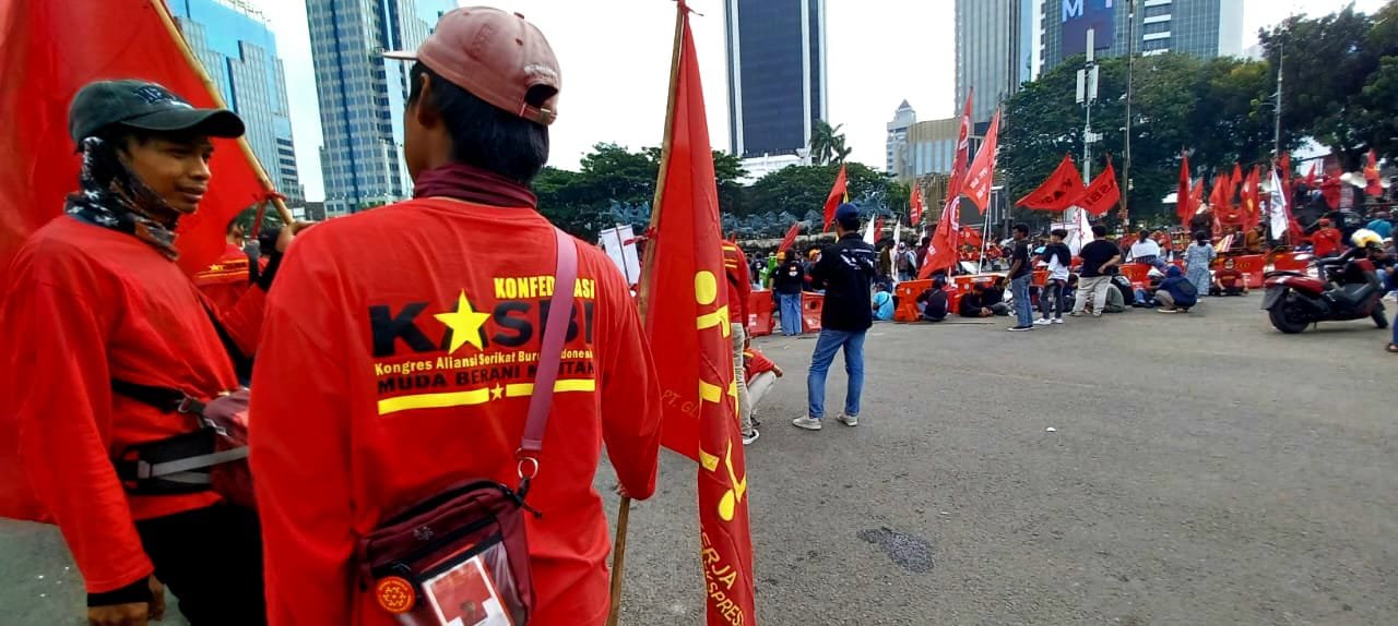 - Spanduk bertuliskan tuntutan buruh untuk kesejahteraan pekerja