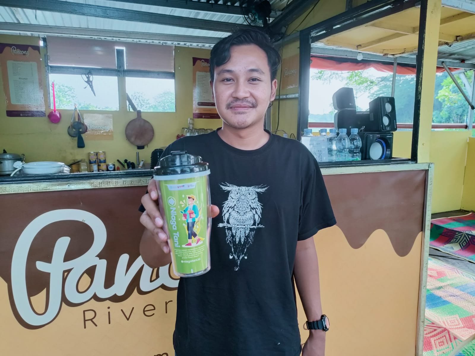 - Irfan sedang memegang tumbler yang diberikjan oleh Marketplace Niagatani