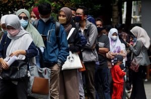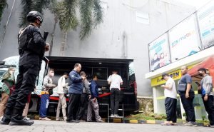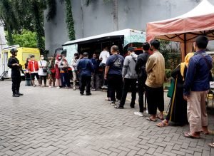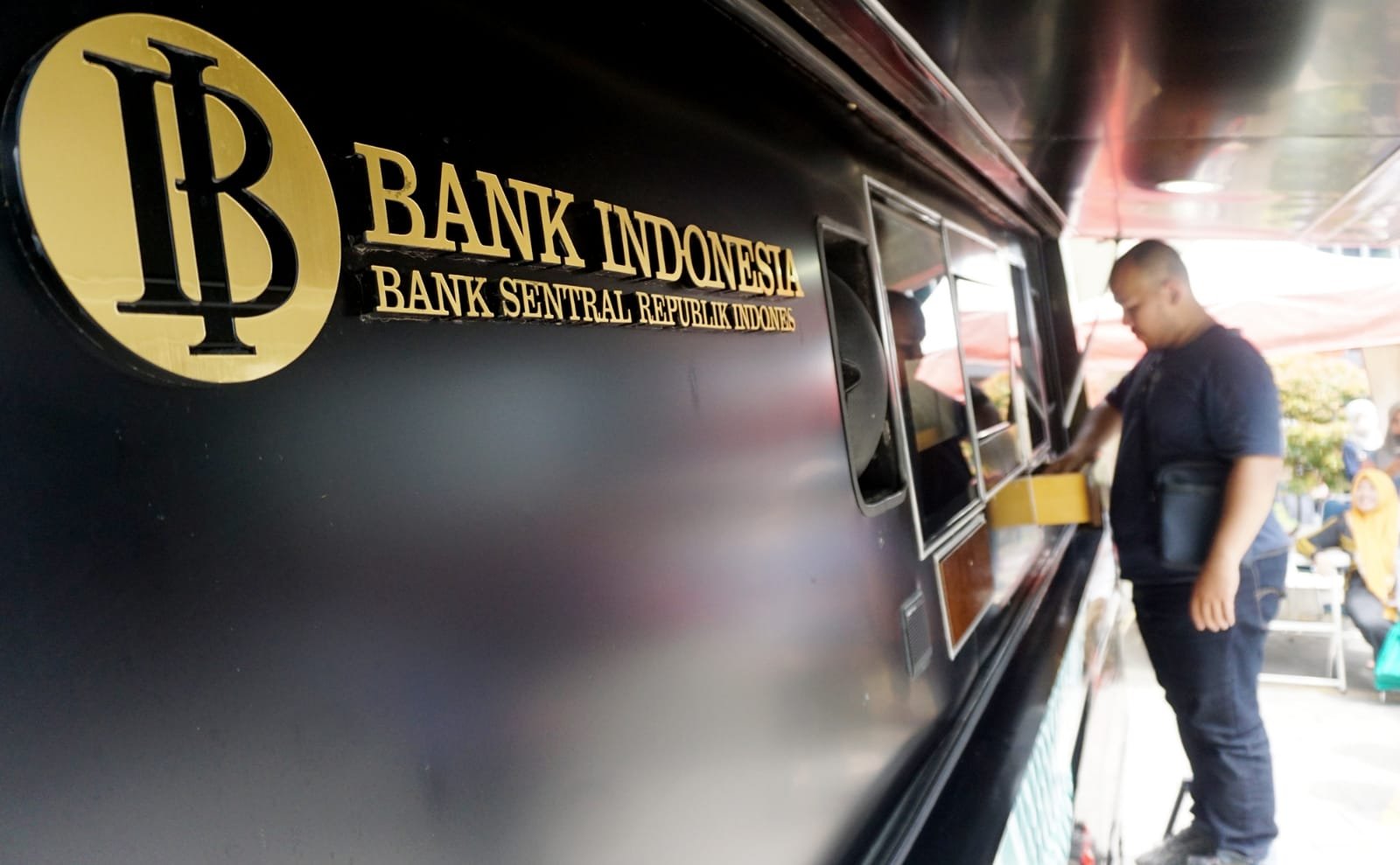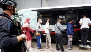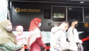 Bank Indonesia mulai membuka gerai penukaran uang bagi masyarakat di halaman Bank BTN Cikokol, Kota Tangerang. Warga yang ingin menukarkan uangnya bisa langsung mendatangi gerai BI Mobile dengan mendaftarkan diri terlebih dahulu melalui Aplikasi BI Pintar. Dalam penukarannya kali ini pihak BI hanya membatasi maksimal penukaran Rp. 3.800.000/orang. Terlihat petugas tim Gegana Brimob Polda Banten sedang bertugas pengamanan di lokasi tersebut. Jumat (31/3/2023). PotretBanten.com/Leoni.
