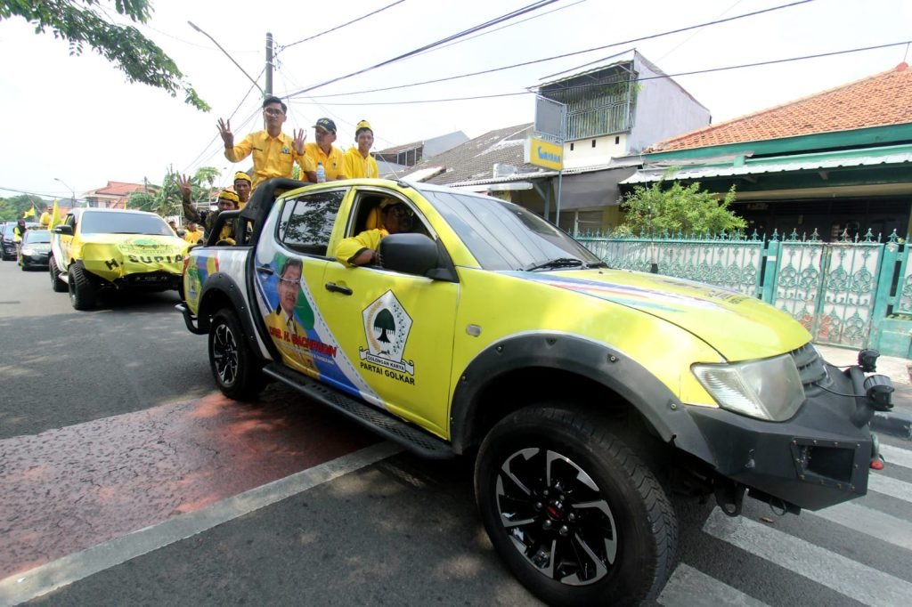 - Simpatisan Partai GOLKAR menaiki mobil menuju KPU Kota Tangerang