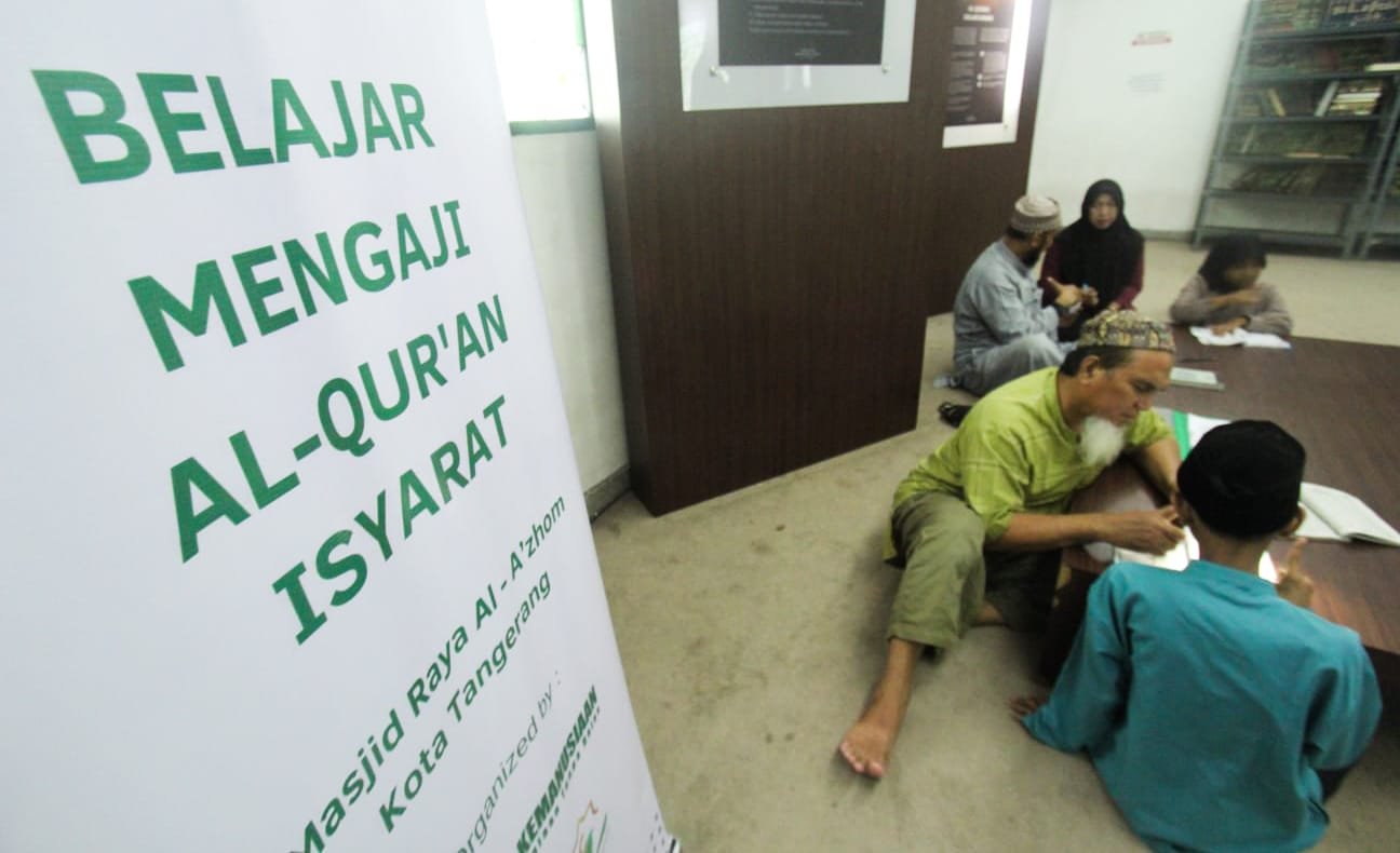 Kegiatan mengaji AL-QURAN isyarat ini dimulai sejak awal Oktober 2023 di Masjid Raya Al A’zhom Kota Tangerang. Kegiatan yang diadakan oleh Asosiasi Tuli Muslim Indonesia (ATMI) diikuti sekitar 34 anak-anak tunarungu, rutin dilaksanakan setiap hari selasa, setelah dzuhur. Para pengajar pengajian Isyarat tersebut langsung di pimpin oleh Ustad. Rama Syahti Ketua ATMI Pusat yang di bawah langsung Kemenag (Kementrian Agama). Dalam mengajar pengajian Isyarat ini peserta tidak di pungut biaya. Selasa (30/1/2024).baksampah.me/Leoni.