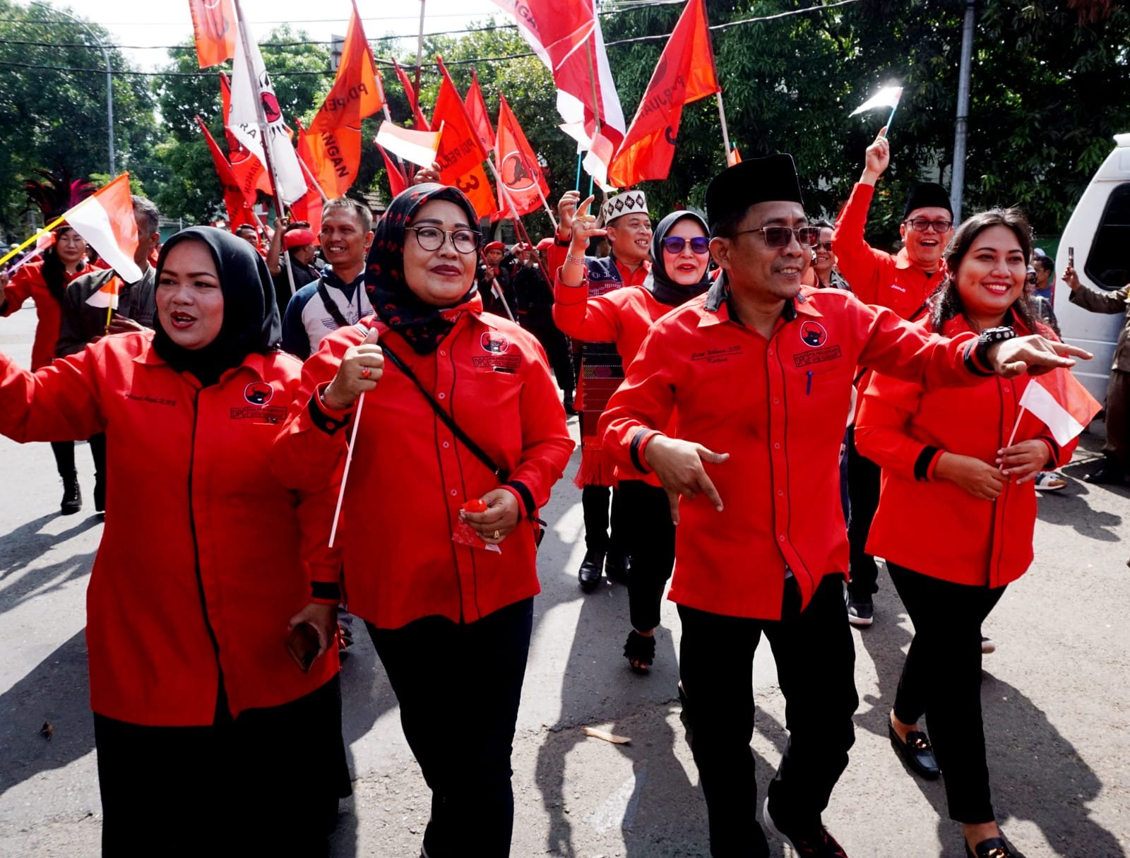 Partai Demokrasi Indonesia Perjuangan ( PDIP ) melakukankirab budaya dalam proses pendaftaran bakal calon anggota legislatif (caleg) DPR untuk Pemilu 2024, Kamis (11/5/2023) pagi ini.Kirab budaya dimulai dari depan taman prestasi menuju kantor KPU Kota Tangerang. Jalan. Nyimas Melati No. 16. Kelurahan Sukarasa. Kecamatan. Tangerang. Kota Tangerang. Dalam mengantar Calegnya terlihat Ketua DPC. PDI Perjuangan Gatot Wibowo duduk diatas kepala Reog (singa) yang mengantar langsung ke Kantor Komisi Pemilihan Umum (KPU). Kamis (11/5/23).Potretbanten.com/Leoni.