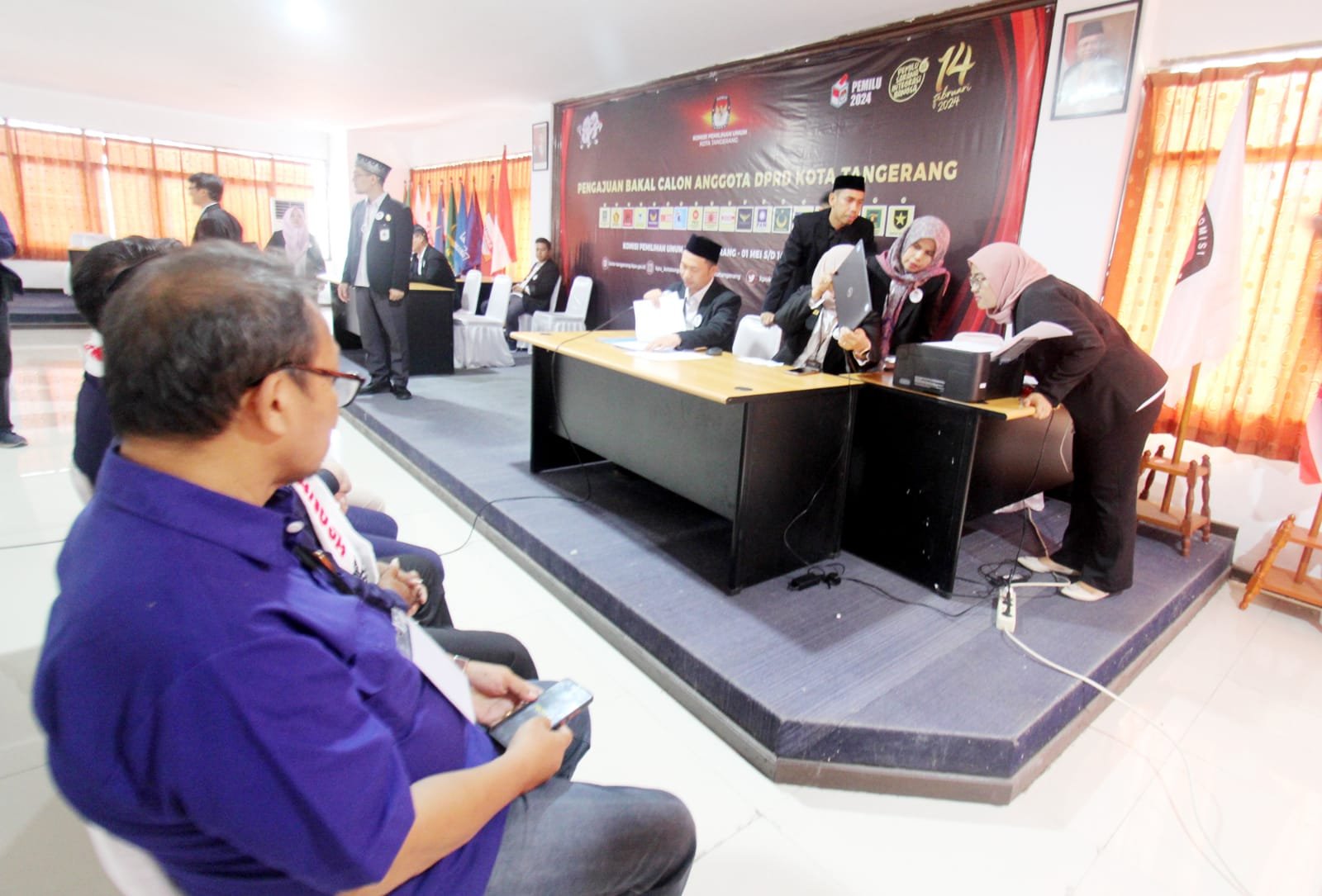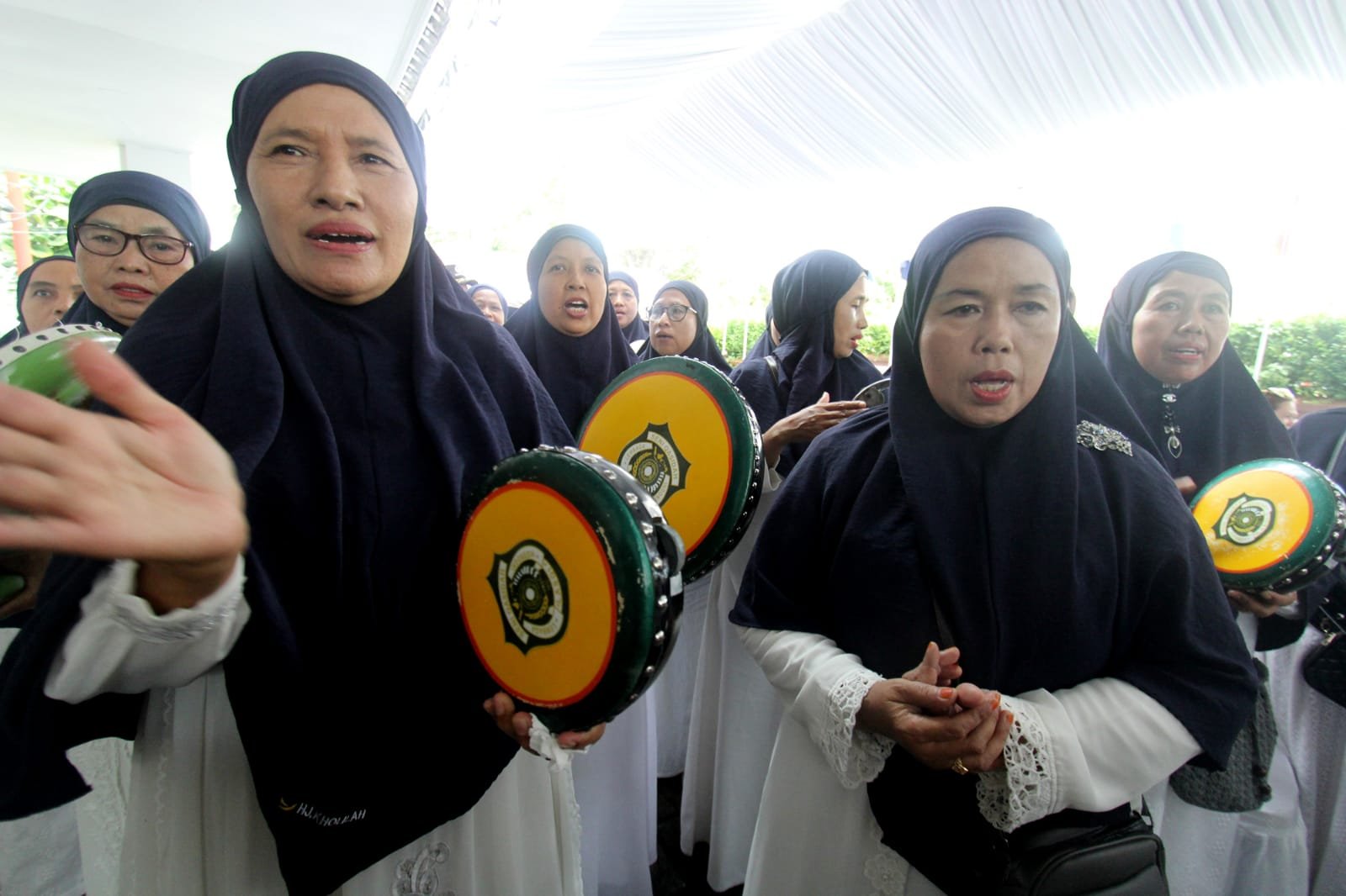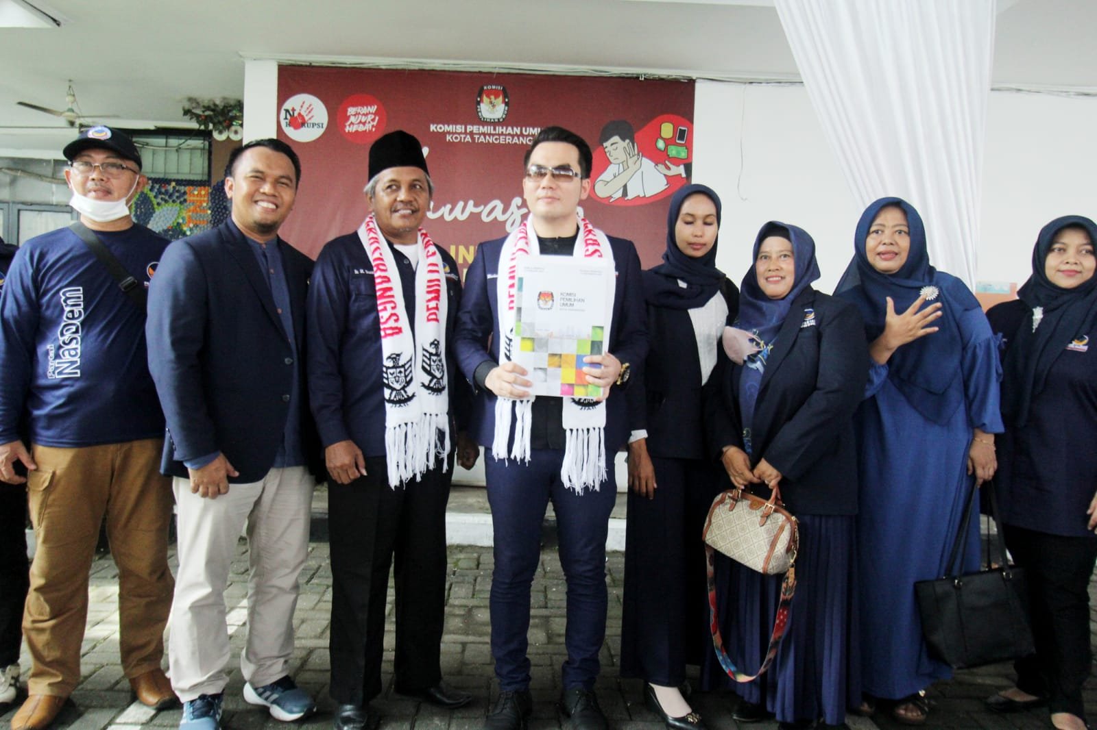 Partai NasDem hari ini lakukan pendaftaran para Caleg ke Kantor KPU Kota Tangerang jalan Nyimas Melati No.16, RT.005/RW.001, Sukarasa, Kec. Tangerang, Kota Tangerang, Banten 1511. Setelah dua kali batal untuk mendaftarkan para Calegnya waktu lalu. Kini Partai NasDem resmi mendaftarkan calegnya sebanyak 50 orang, dan sudah memenuhi persyaratan yang 34% nya calon legislatif perempuan. Dalam mengantarkan para Calegnya Partai NasDem membawa masa ibu-ibu dari majelis taklim untuk menghibur para Caleg yang sedang mendaftar. Nampak terlihat ibu-ibu dari majelis taklim sedang bermain rebana depan halaman Kantor Komisi Pemilihan Umum (KPU), usai calon legislatif dinyatakan lolos persyaratan pendaftaran oleh KPU. Kamis (11/5/2023).Potretbanten.com/Leoni.