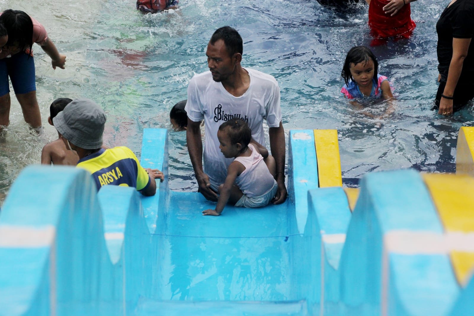 - Seorang bapak mengajak main anaknya di kolam renang Boash Waterpark