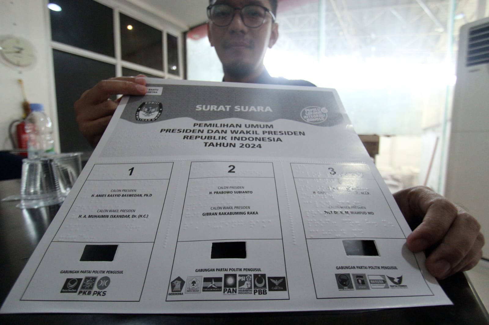Kertas Suara khusus disabilitas sebanyak 4.478 kertas suara yang ada di Kota Tangerang. Kertas suara untuk tuna netra sebanyak 8%. Adapun perbedaan kertas suara khusus ini menggunakan huruf Braille dan tidak ada foto pada kertas surat suara. Kertas Surat Suara khusus tuna netra hanya Kertas Surat Suara PPWP dan Kertas Suara DPD Provinsi. Terlihat petugas Gudang Logistik sedang menunjukan kertas surat suara khusus di gudang logistik KPU Kecamatan Benda Kota Tangerang. Selasa (16/1/24). PotretBanten.com/Leoni.