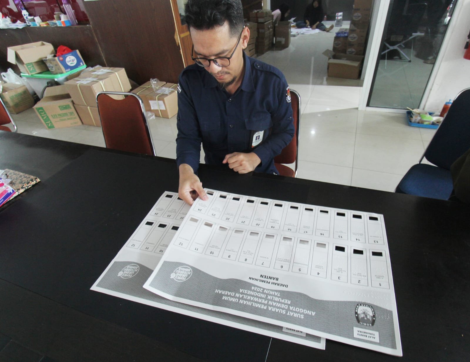 Kertas Suara khusus disabilitas sebanyak 4.478 kertas suara yang ada di Kota Tangerang. Kertas suara untuk tuna netra sebanyak 8%. Adapun perbedaan kertas suara khusus ini menggunakan huruf Braille dan tidak ada foto pada kertas surat suara. Kertas Surat Suara khusus tuna netra hanya Kertas Surat Suara PPWP dan Kertas Suara DPD Provinsi. Terlihat petugas Gudang Logistik sedang menunjukan kertas surat suara khusus di gudang logistik KPU Kecamatan Benda Kota Tangerang. Selasa (16/1/24). PotretBanten.com/Leoni.
