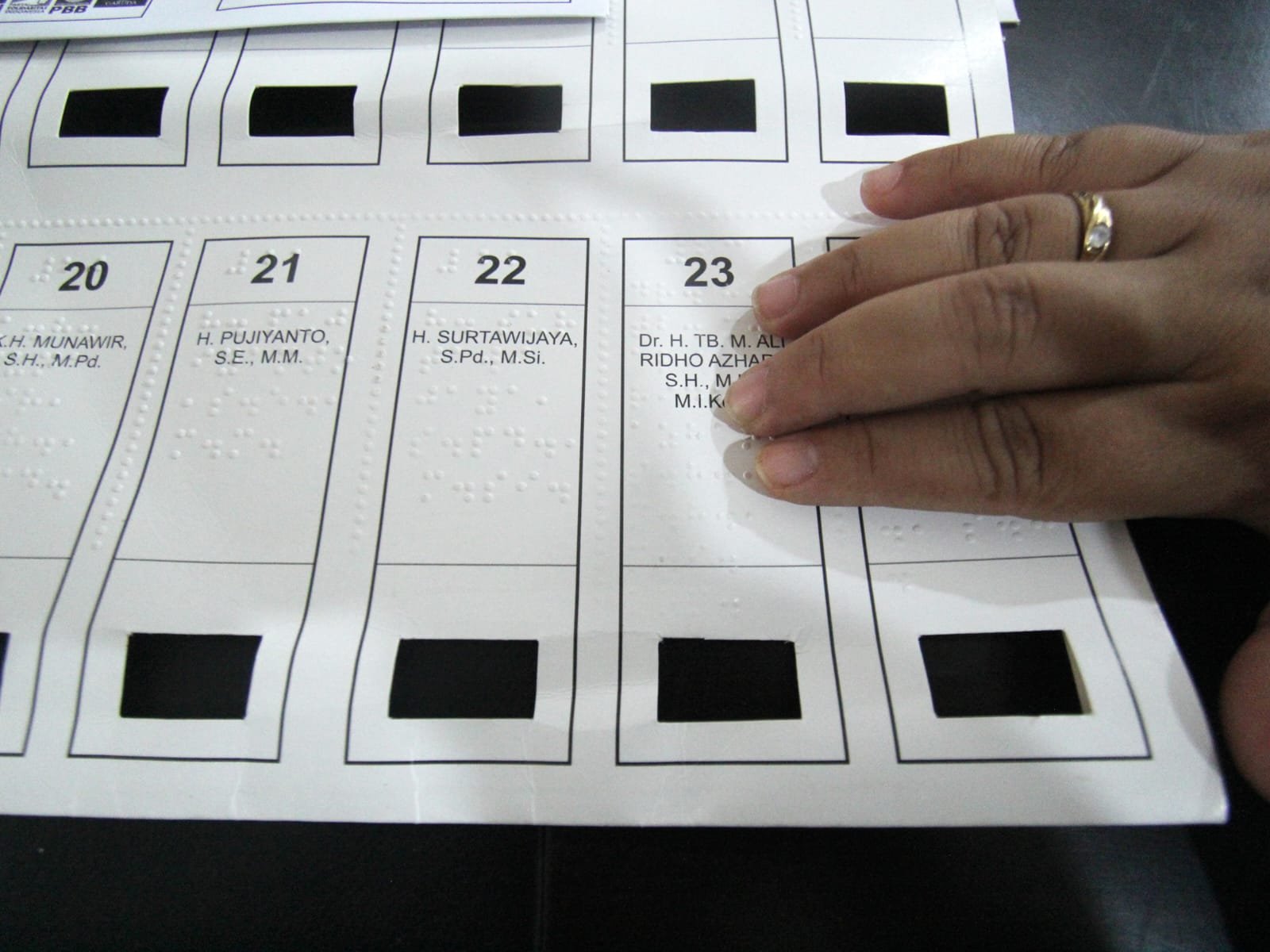 - Petugas KPU sedang memperlihatkan surat suara khusus disabilitas