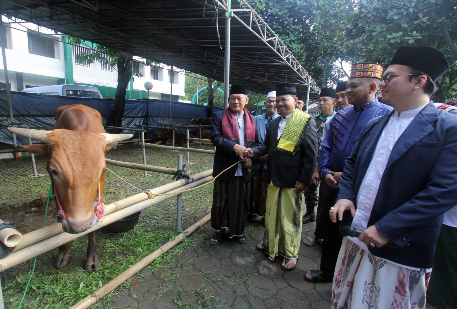 Umat muslim merayakan hari raya Iduladha 1444 H , warga Kota Tangerang melakukan sholat Ied di Masjid Raya Al Azhom Kota Tangerang. Usai melaksanakan sholat Wakil Walikota Tangerang Sachrudin menyaksikan prosesi pemotongan hewan kurban di halaman belakang masjid Raya Al Azhom. Terlihat wakil walikota Tangerang menyerahkan hewan kurban secara simbolis kepada pengurus Masjid Raya Al Azhom. Kamis (29/6/2023).baksampah.me/Leoni.