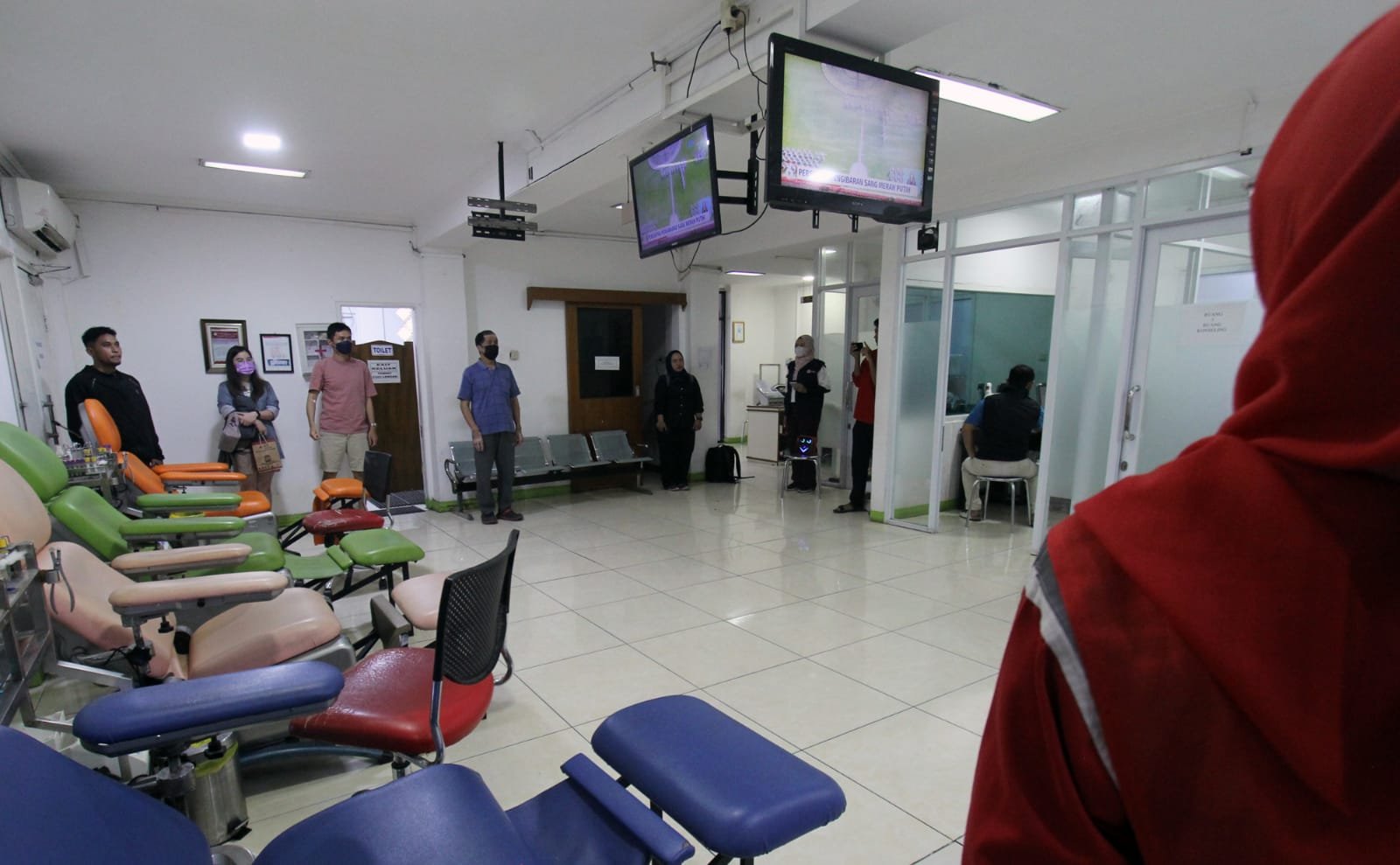Memperingati HUT RI ke 78, seluruh rakyat Indonesia diminta mengambil sikap sempurna pada pukul 10.17 WIB. Imbauan tersebut guna melakukan penghentian sementara segala aktifitas selama tiga menit dengan sikap sempurna pada detik-detik proklamasi kemerdekaan Republik Indonesia. Seperti yang dilakukan anggota PMI (Palang Merah Indonesia) Kota Tangerang dan para pendonor , mereka mengambil sikap sempurna dan menyanyikan Lagu Kebangsaan Indonesia Raya pada pukul 10.17 WIB. Terlihat anggota PMI dan pendonor darah sedang berdiri mengambil sikap sempurna. Kamis (17/8/2023).baksampah.me/Leoni.